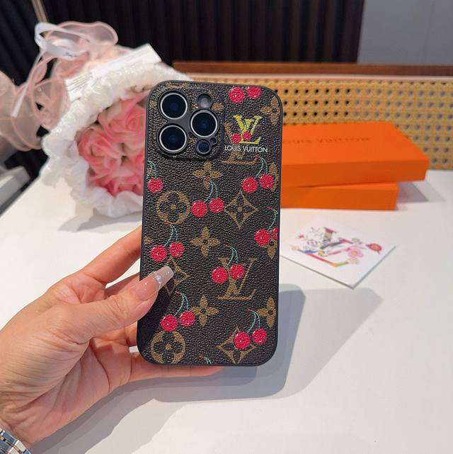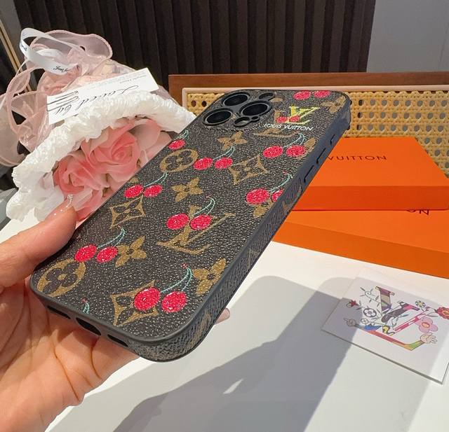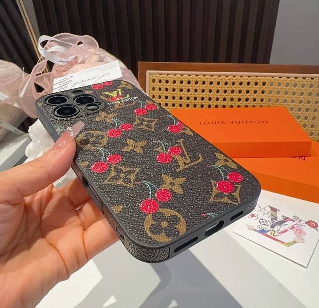 Lv fine hole full cover mobile phone case Murakami cherry pattern Lv full surround edge leather mobile phone case