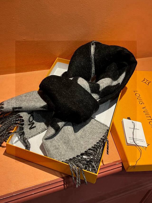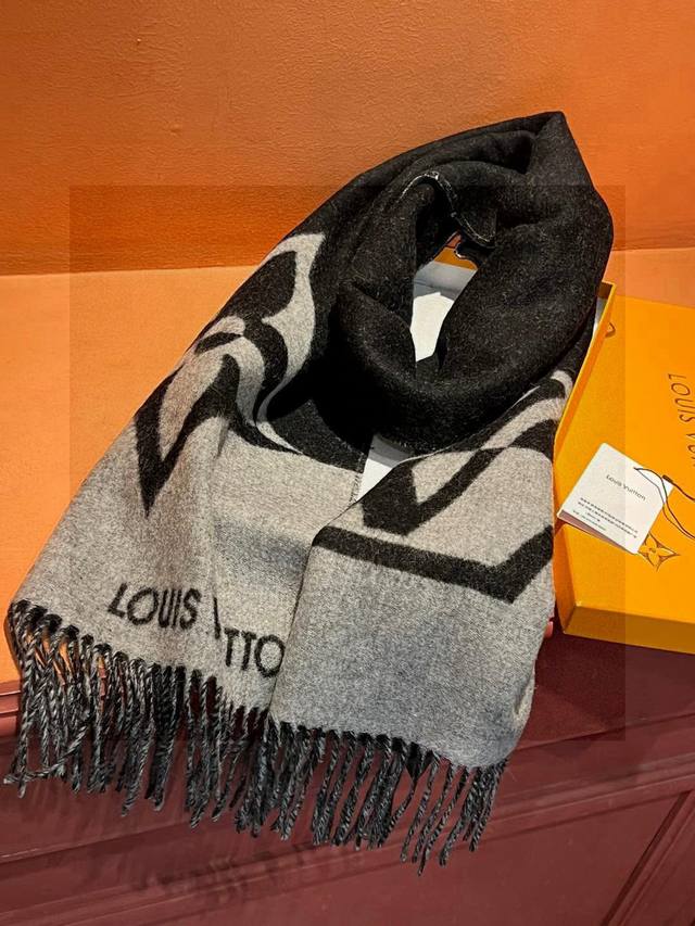Lv Graphic Dual scarf is crafted from a soft, high-quality wool blend and cut into a wide size. The striking two-tone design highlights the Lv logo, and flipping it reveals the Monogram flowers and Louis Vuitton logo