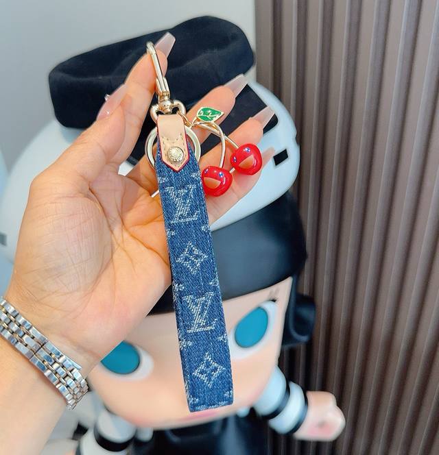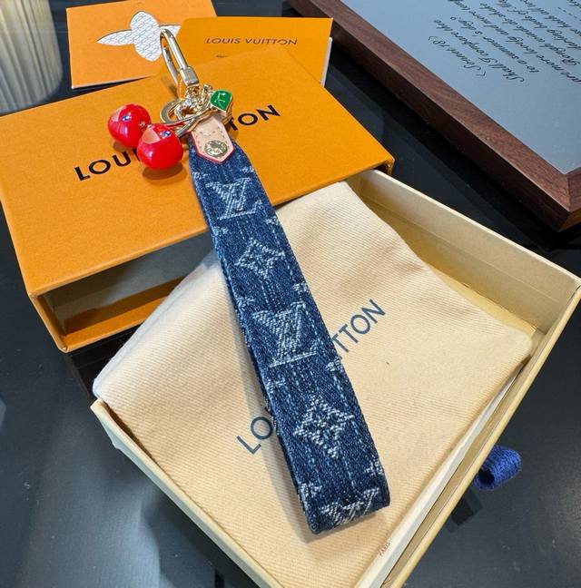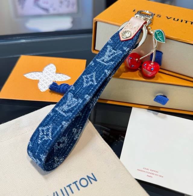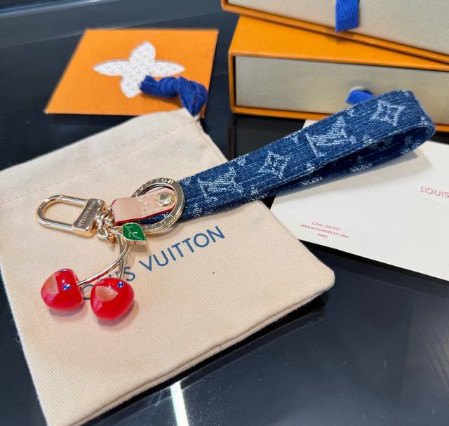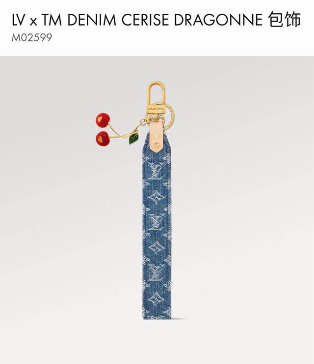 Lv keychain bag charm. The Lv Xtm Denim Cerise Dragonne bag charm is part of the Louis Vuitton x Takashi Murakami retro collection, a playful tribute to artistic creativity and exquisite craftsmanship. The smiling cherry embellishment captures the Japanese artist's anime perspective. Paired with a Monogram embroidered denim strap and a convenient spring buckle, it adds a modern touch to any look.