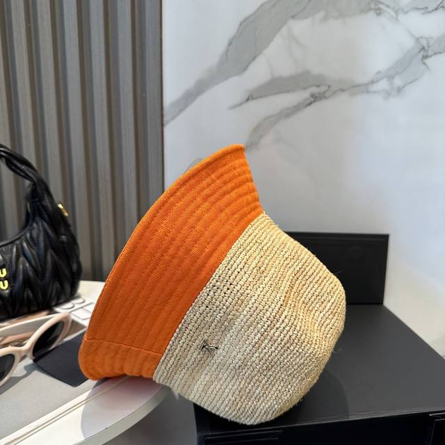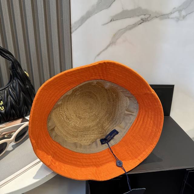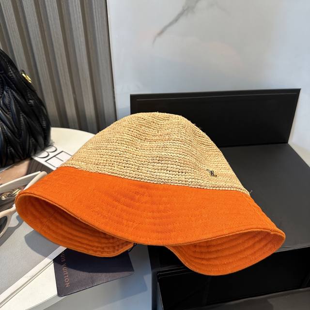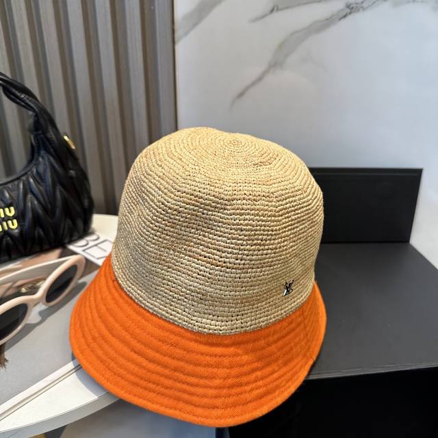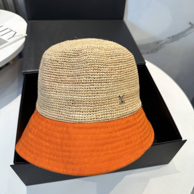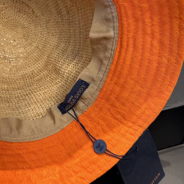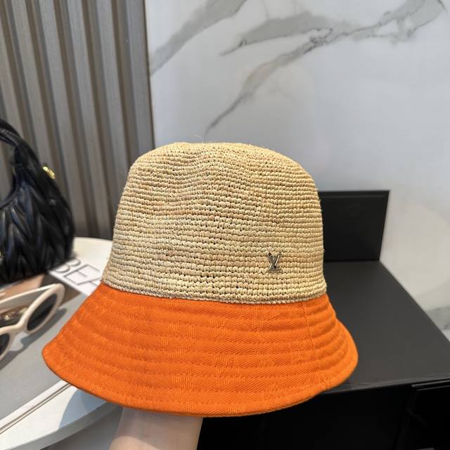 Lv Louis Vuitton Imported Raffia Straw Color-Blocked Bucket Hat, Simple Yet Elegant, Low-Key Luxury, Highly Stylish! Fisherman's Hat Design, Truly Beautiful And Versatile.