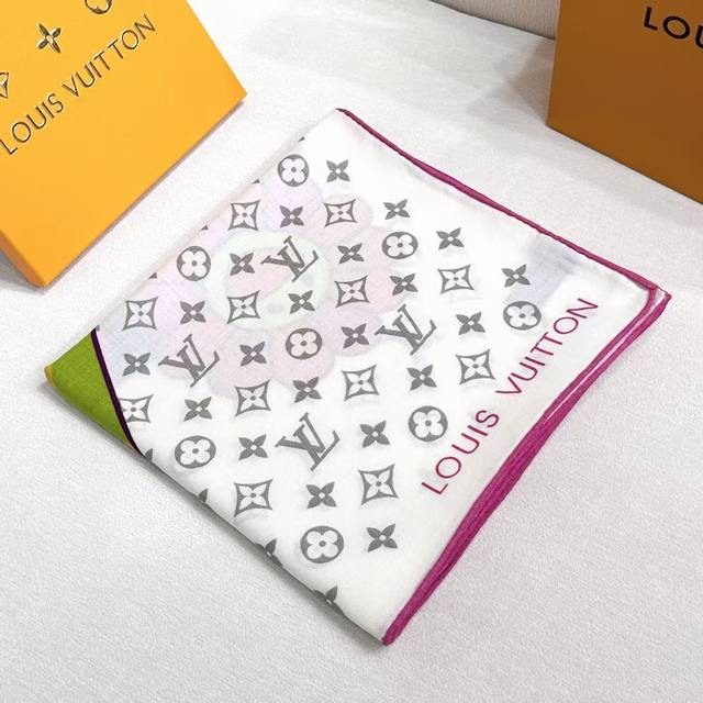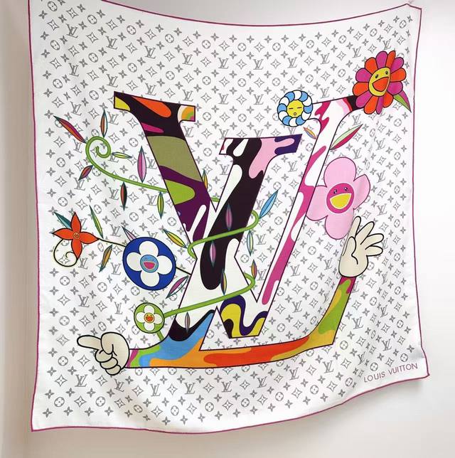 Lv X Tm Superflat Handkerchief DDD Top-quality velvet double-sided tonal handkerchief DDD The Lv X Tm Monogram Superflat velvet handkerchief is from the collaboration between Louis Vuitton and Japanese artist Takashi Murakami, creatively intertwining the large Lv Hands logo, smiling flowers, and brand elements to showcase the artist's signature "superflat" style. Vibrant colors contrast strikingly against the full-width Monogram background, and the wide size unlocks multiple styling possibilities. DDD 135 x 135 cm DDD Height x Length DDD 30% Silk 70% Cashmere DDD Full-width Monogram DDD Inkjet Printing DDD Louis Vuitton Logo DDD