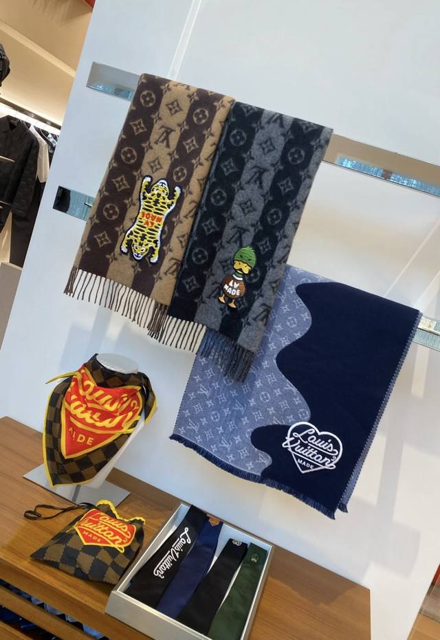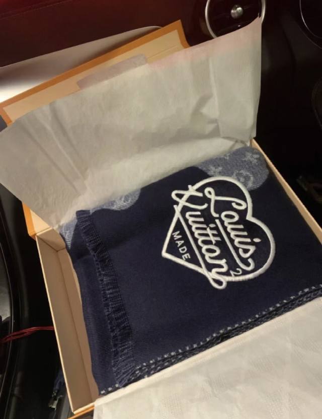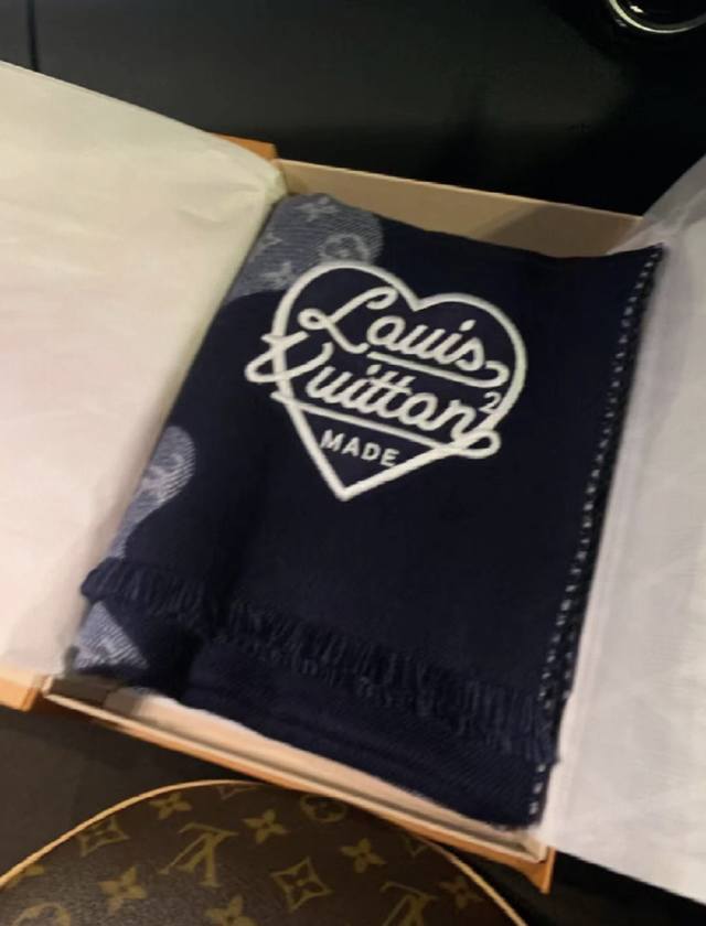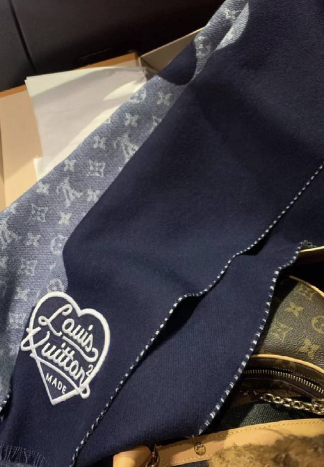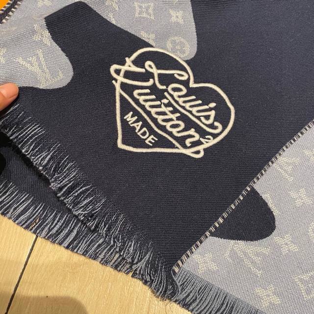 Lv's latest style is here! The globally popular Nigo collaboration denim blue scarf is unisex and looks good on both men and women. This scarf features a flowing ripple pattern connecting the classic Monogram pattern to a clean denim base. The bottom is decorated with a donkey-themed Made Heart embroidery and short tassel trim. Specifications: 200 x 43cm, MP4210. Perfectly matched to the original design and size. 100% sheep's wool. Full-width Monogram pattern heart embroidery appliqu