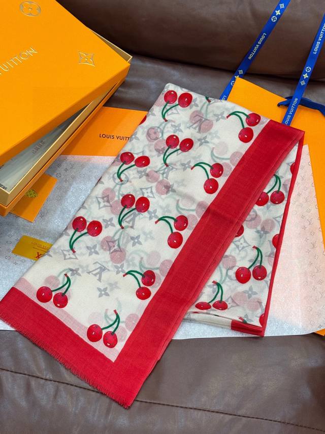 New arrival: the new Cherry Lv Cashmere Square Scarf. The Lv x Tm Monogram Cerise scarf is part of the Louis Vuitton x Takashi Murakami re-edition collection, reinterpreting the classic brand logo with a vibrant artistic style. The Monogram background and Murakami's colorful cherry pattern create a vibrant summery vibe, perfectly complementing other pieces in the collection.