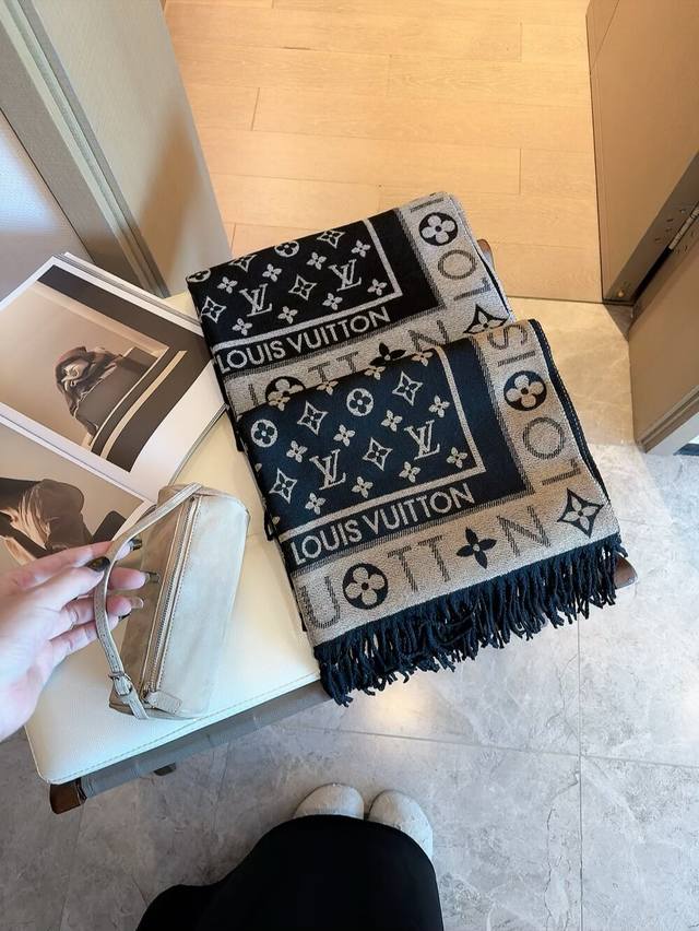 New Louis Vuitton L Classic Monogram Pattern Long Scarf, 1:1 replica. This Simply LV scarf prominently enlarges the classic Monogram pattern across the entire scarf, showcasing Louis Vuitton's design heritage while adding a focal point to everyday wear. Paired with long, delicate tassels, it offers a relaxed alternative to the Reykjavik and Logomania scarves. Material: 100% wool, Size: 196*65 mm.