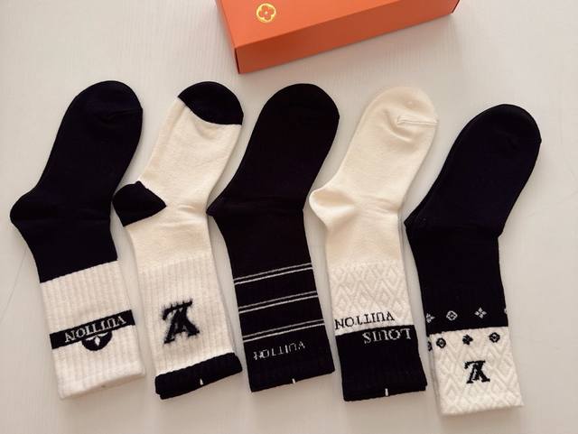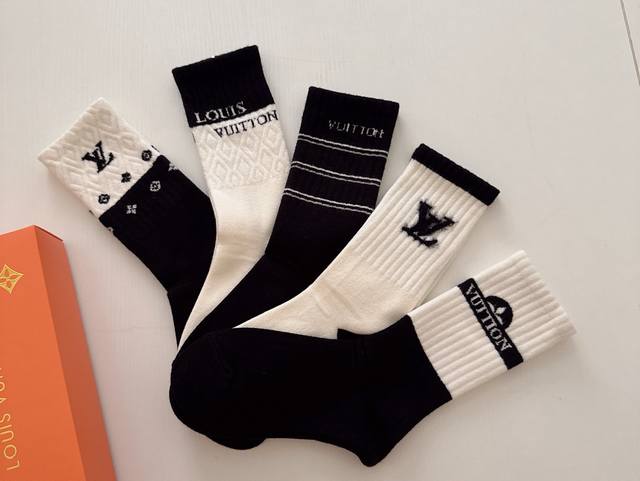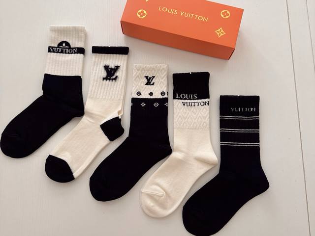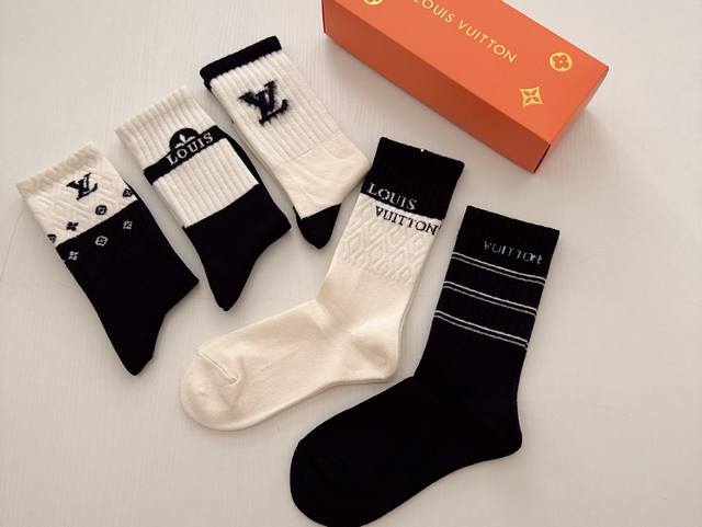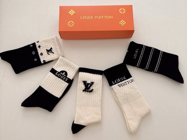 New Louis Vuitton women's cashmere knee-high socks, five pairs per box, jacquard design with classic LV logo. Super eye-catching, looks amazing in person, love it! A super popular item on Instagram, a must-have for fashionistas, super easy to match.