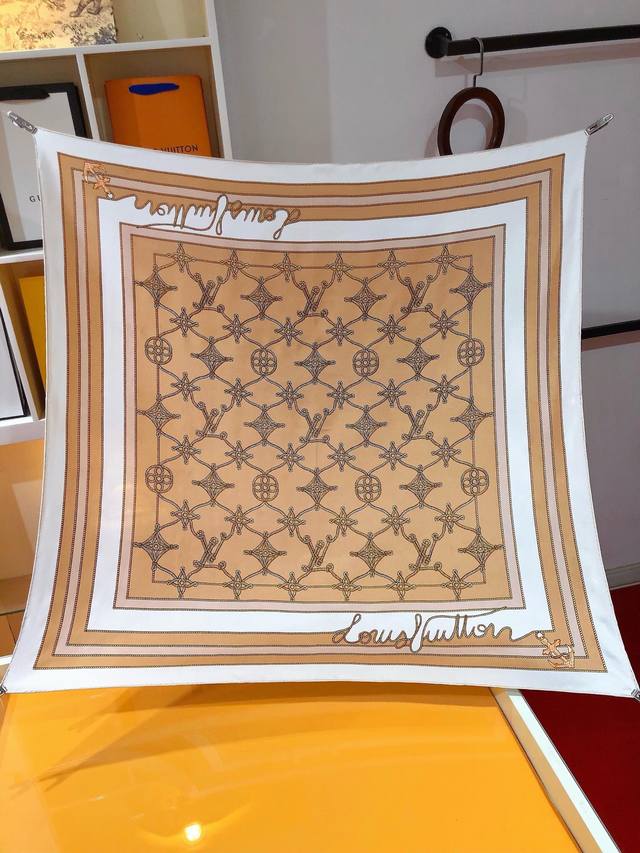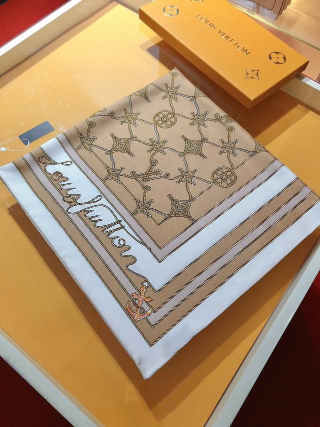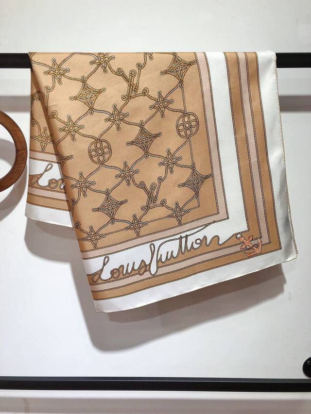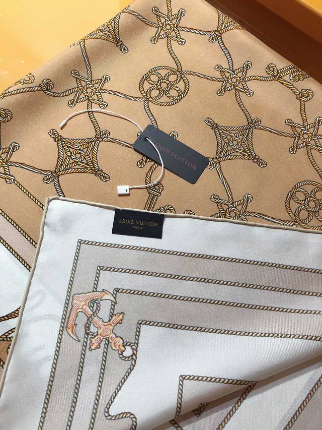 Slv2412 Original Lv Cordage 90cm Silk Square Scarf. This scarf transforms the Monogram flowers, letters, and brand logo into the knots and coils of ship ropes, using anchor elements to highlight the nautical trend and inject an elegant and poetic touch into the classic design. Made of premium twill silk, it features pure hand-curled edges for a luxurious feel. The latest counter fabrics are designed for styling and a crisp feel. High-end designers use color schemes that take into account the wearer's effect and color saturation. The colors are fresh and rich, very refined, and have a ladylike temperament! Good things don't wait, so don't miss it if you like it! Order now! Ingredients and Size: 90X90cm 100% twill silk