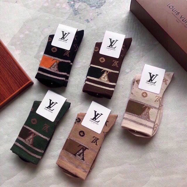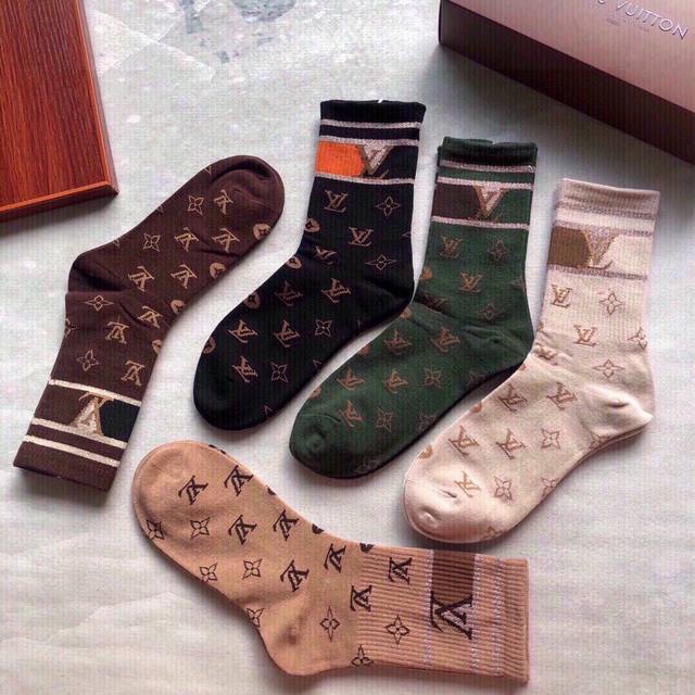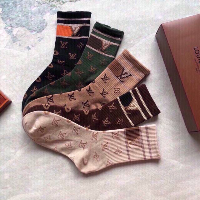 Special Louis Vuitton women's new mid-calf socks, five pairs per box. Made of pure cotton, soft, comfortable and breathable, with classic jacquard cuffs and a classic logo on the socks. Super nice style, the same brand socks are released at the counter, a must-have for fashionistas, super easy to match.