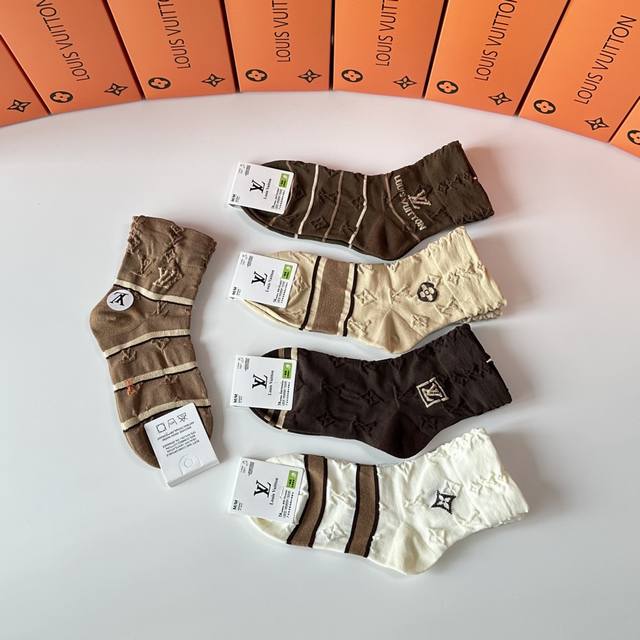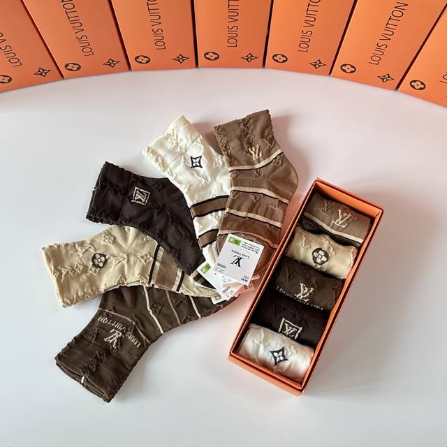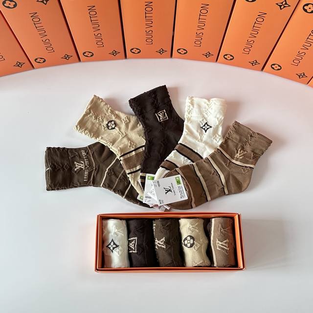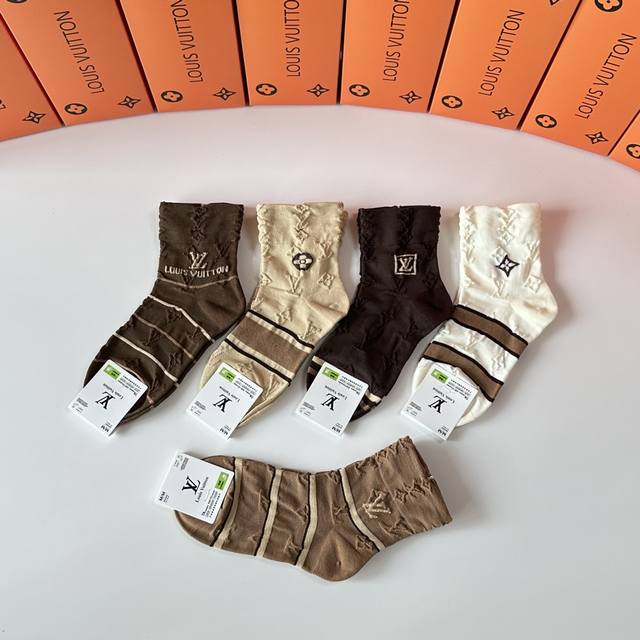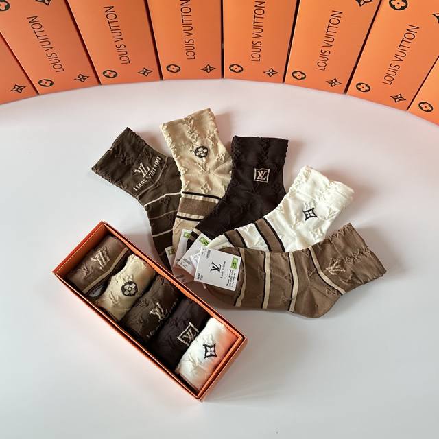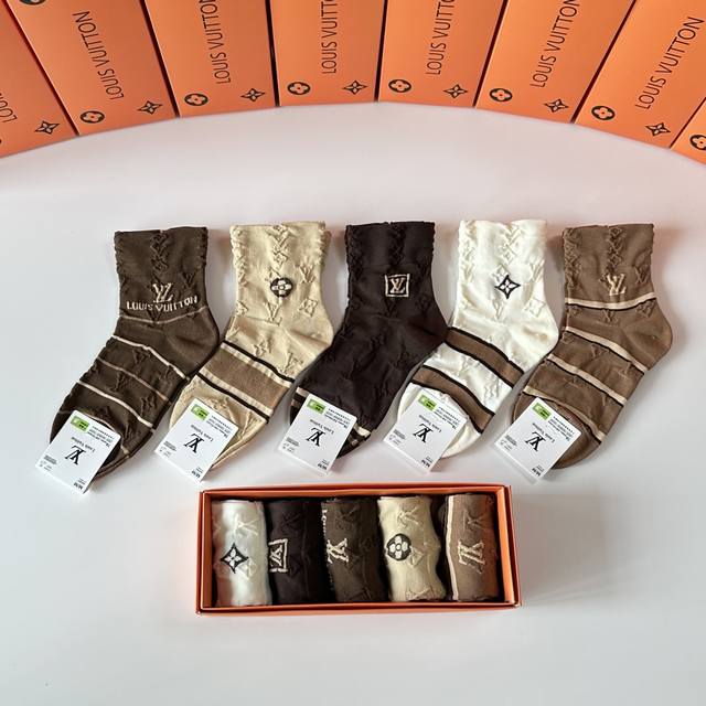 Specially packaged Louis Vuitton new mid-calf socks/slouch socks! Five pairs per box, same style as in boutiques, a must-have for trendsetters, super easy to match.