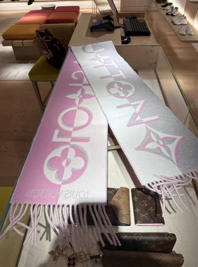 The Duo Infinity scarf is crafted from soft, rich sheep wool. Its double-sided design features a large Monogram Infinity logo, creating a striking contrast in contrasting colors. It can be casually worn over the shoulder or tied around the neck for a touch of warmth during colder months.