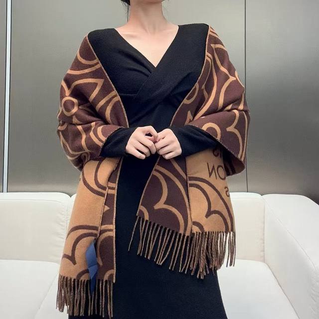 The Lv In Bloom scarf showcases a large Monogram flower in a wide format, expressing a visual concept of maximalism. The plush blend provides warmth in winter. Reversible.