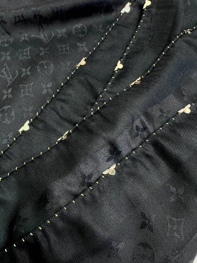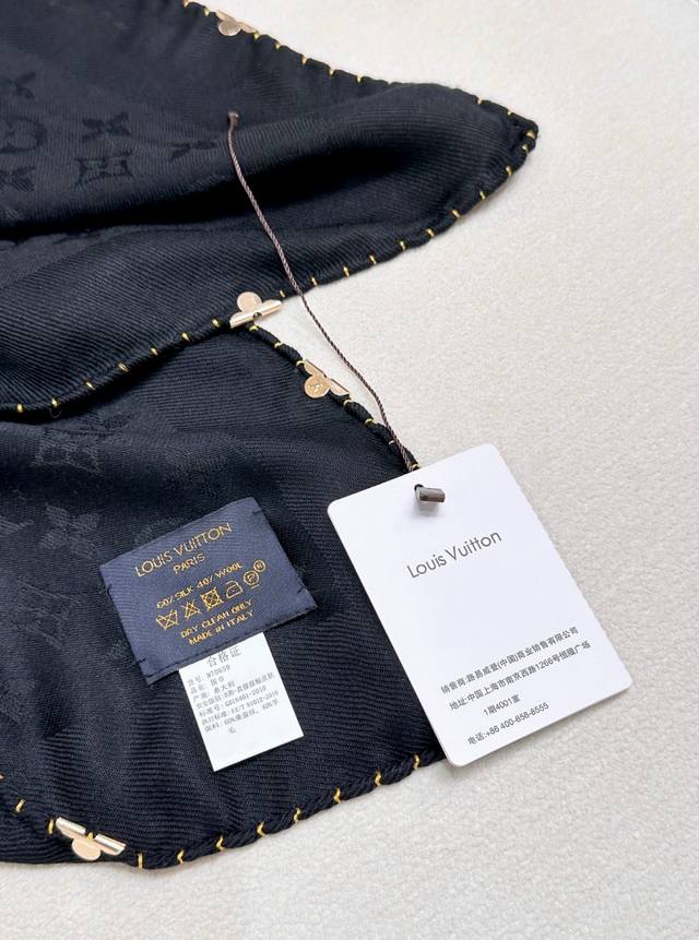 The ultimate, exquisite, and heavyweight version!!! The details are truly amazing! Limited edition LV monogram metal clasp, handmade gold thread rolled hem shawl!! This rolled hem is incredibly time-consuming; a skilled worker can only make one or two a day, and ordinary workers simply can't do it!! Yes, it's really heavy-duty; you'll be absolutely amazed when you hold it in your hands!!! Besides the excellent overlock edging, the most crucial element is the LV monogram fabric. There are many counterfeit versions on the market, so remember to keep your eyes peeled. Those in the know understand, so I won't elaborate!! You can feel the quality of a good product the moment you touch it! Trust me, the texture in person is absolutely incredible, unbeatable!!! I highly recommend this one; you'll fall in love with it the moment you put it on! Simple yet versatile! The latest limited edition from the boutique is absolutely stunning! The metal and gold thread details are the perfect finishing touch. The pure black monogram is already incredibly versatile, but this limited edition gives it a luxurious and fashionable feel. Black and gold are always understated yet eye-catching! Size: 140*140cm, 60% silk, 40% wool, one color. (