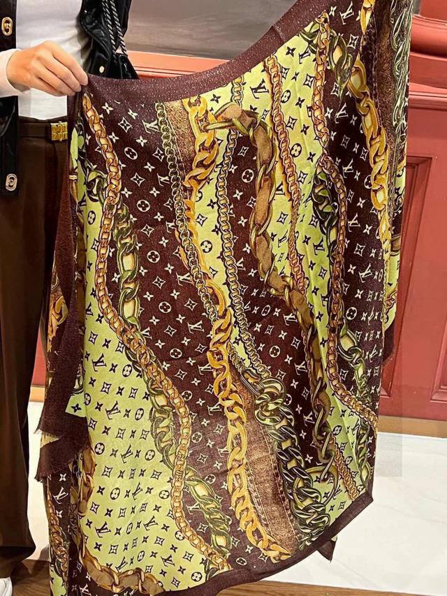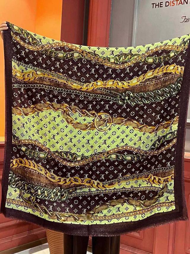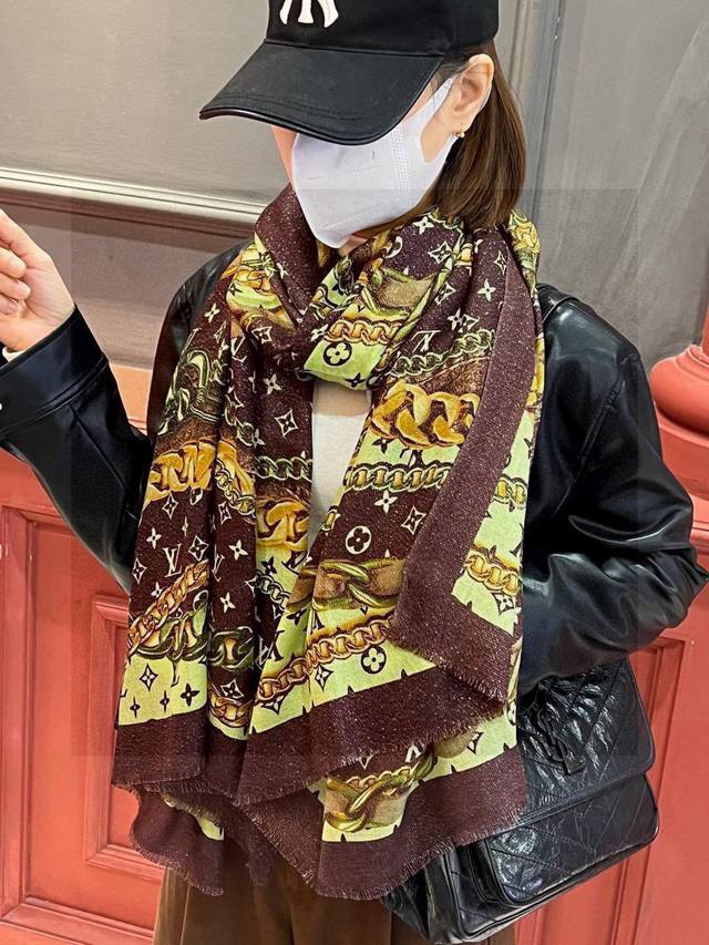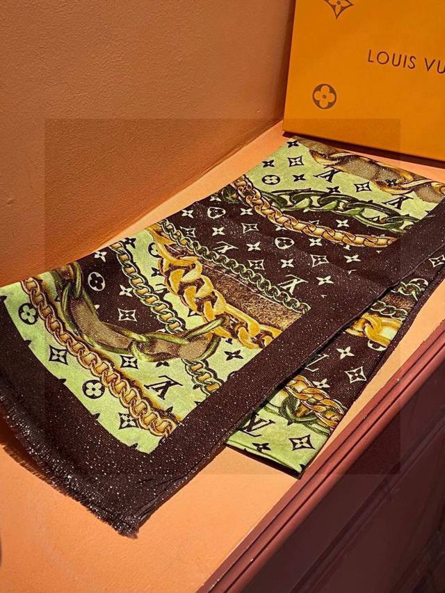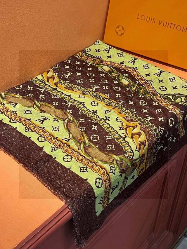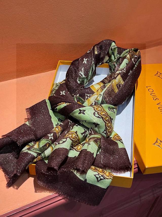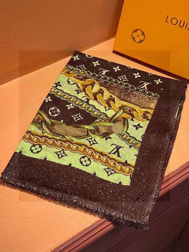 This glowing scarf is truly amazing! A Louis Vuitton chain-patterned silver-thread cashmere long scarf, a new style that captures the elegant colors of the Nouficel capsule collection, continuing the Mix and Srop theme. The Monogom pattern forms the background, interwoven with classic Louis Vuitton elements, cleverly showcasing the brand's exquisite leather craftsmanship. The silk cashmere print is paired with hand-rolled edges. Highly recommended, act fast! This size is perfect, easy to match, and the quality is superb. You'll understand the high-end quality as soon as you hold it. The high-end details are what you see. A must-have for VIP customers. Recommended size: 110*200