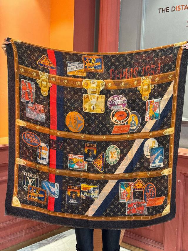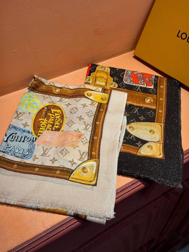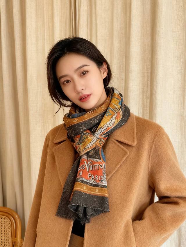 This glowing scarf is truly amazing! A Louis Vuitton L-brand chain bag patterned silver thread long scarf, a silver thread printed cashmere long scarf. The 2025 new silver thread long scarf captures the elegant colors of the Nouficel capsule collection, continuing the Mix and Srop theme. The Monogom pattern forms the background, with classic Louis Vuitton elements interwoven, cleverly showcasing the brand's exquisite leather craftsmanship. The silk cashmere print is paired with hand-rolled edges. Highly recommended, while supplies last! This size is just right, very versatile, and the quality is superb. You'll understand the high-end quality as soon as you hold it. The high-end details are what you see. A must-have for VIP customers. Recommended size: 110*200