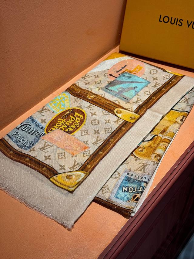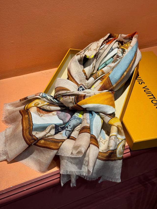 This glowing scarf is truly amazing! A Louis Vuitton L-brand chain bag patterned silver thread long scarf, a silver thread printed cashmere long scarf. The 2025 new silver thread long scarf captures the elegant colors of the Nouficel capsule collection, continuing the Mix and Srop theme. The Monogom pattern forms the background, with classic Louis Vuitton elements interwoven, cleverly showcasing the brand's exquisite leather craftsmanship. The silk cashmere print is paired with hand-rolled edges. Highly recommended, while supplies last! This size is just right, very versatile, and the quality is superb. You'll understand the high-end quality as soon as you hold it. The high-end details are what you see. A must-have for VIP customers. Recommended size: 110*200