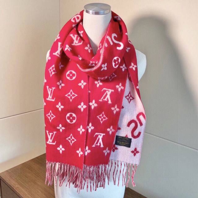 Top-quality Supreme LV collaboration scarf, super soft and supple. A must-have for fashionistas! Made with 90% wool and 10% cashmere, this scarf is incredibly soft and delicate, absolutely skin-friendly and won't irritate your neck. The 54 stitching and 18-knit yarn result in an exceptionally fine finish. Unlike other scarves on the market, which often use 28 stitching and 15-knit yarn, this one looks like the surface of the moon