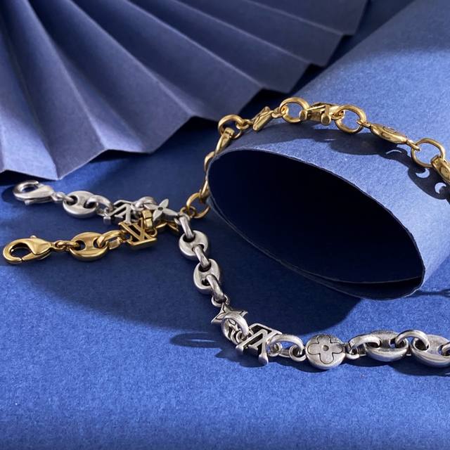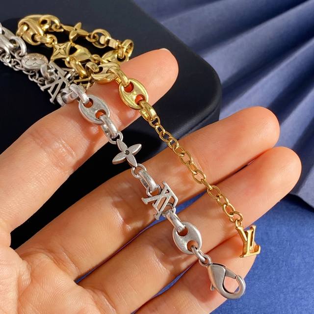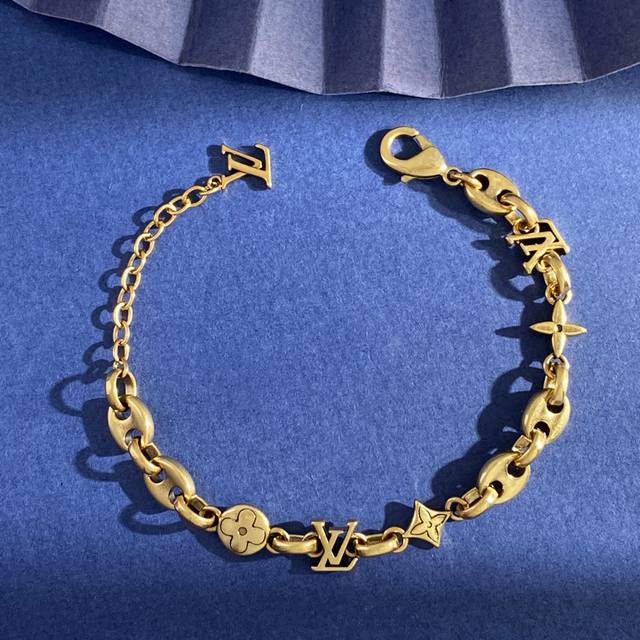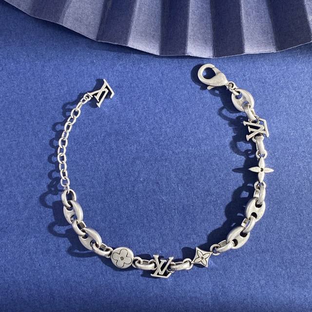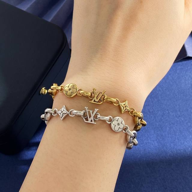 Lv Louis Vuitton new unisex retro design glossy Lv letter pig nose round four-leaf flower diamond cross flower old pattern multi-element distressed bracelet brass material antique bronze antique silver weight about 12.2G bracelet length about 16cm + 3.5cm + 1cm tail plate