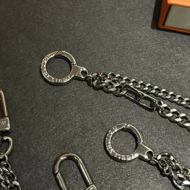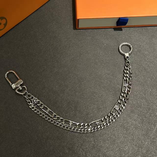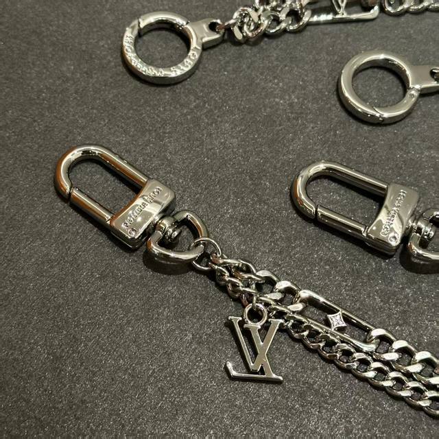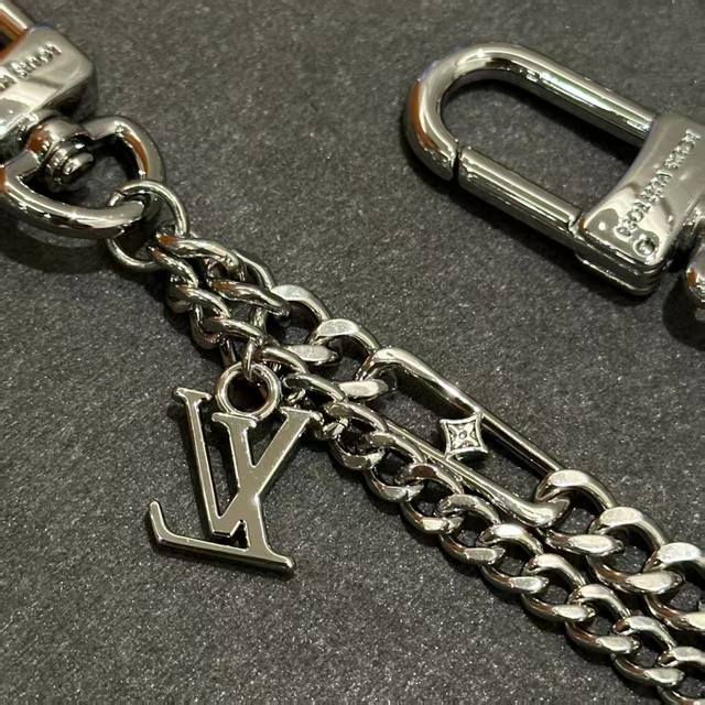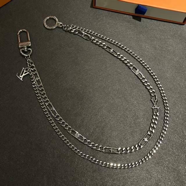 The Lvfigaro belt chain features a double-link design forged from lustrous brass, with the brand's signature logo cleverly embedded between the links. The Lv initials elegantly drape at one end, and a spring clasp allows for easy fastening, adding a trendy edge to trousers or handbags.