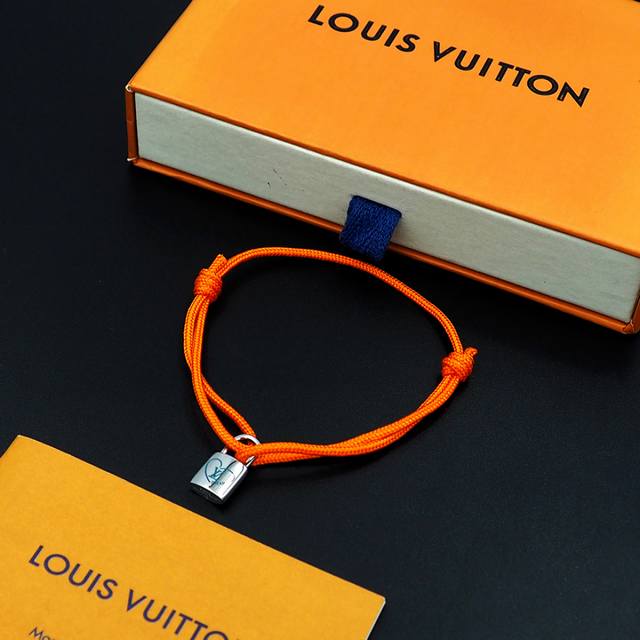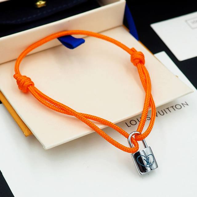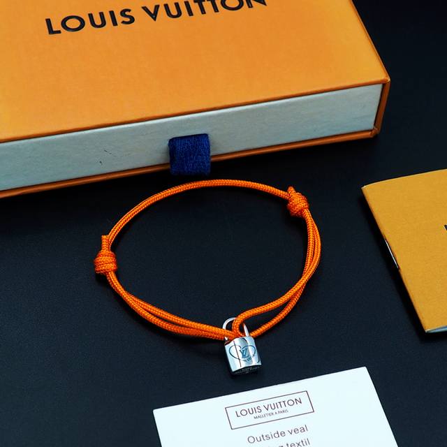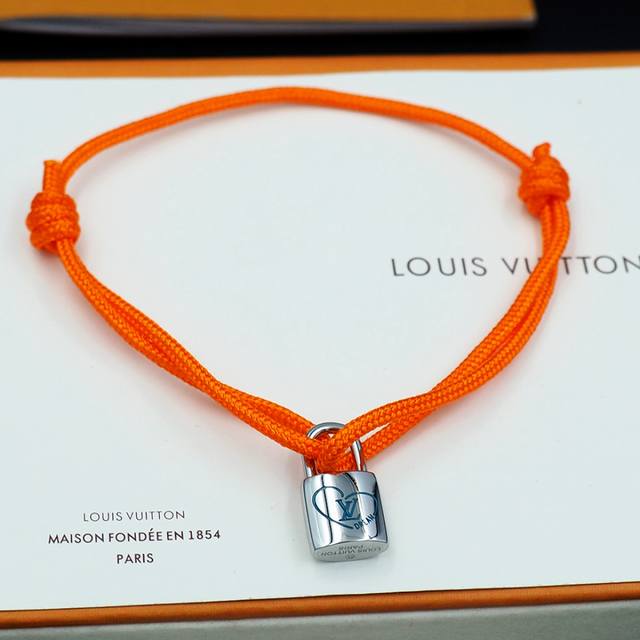Donkey Family Charity Bracelet. This limited-edition Siver Lockt bracelet, part of a collaboration between Louis Vuitton and brand ambassador Lee Yong-bok, embodies the positive message of the renowned K-pop artist through traditional elements. The bracelet is crafted from recycled materials and paired with a fabric cord. It features the iconic padlock Georges-Louis Vitton created for the Steamer bag in 1901. Lee Yong-bok's heart-shaped decoration features the engraved Lv monogram and the word "Dream." The lacquer glaze adds a fresh , modern touch. Wear alone or layered. Orange