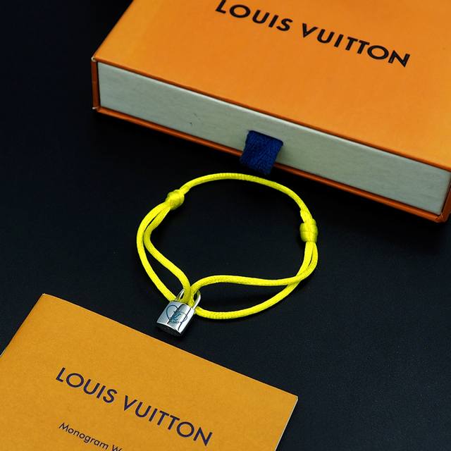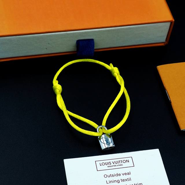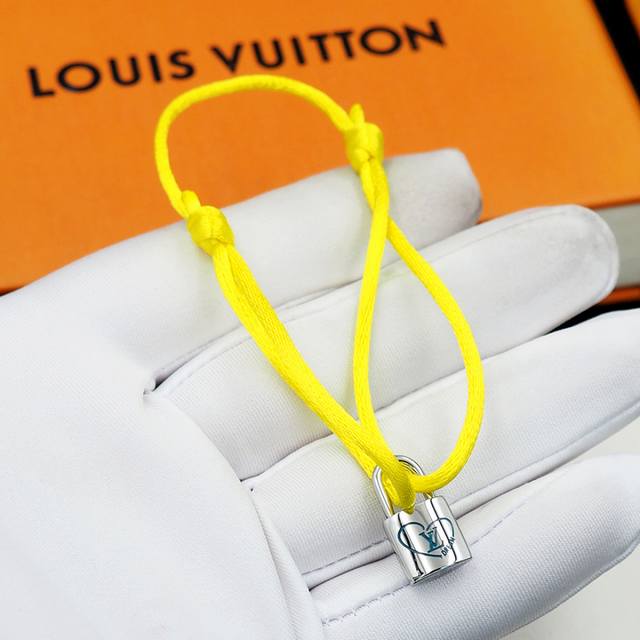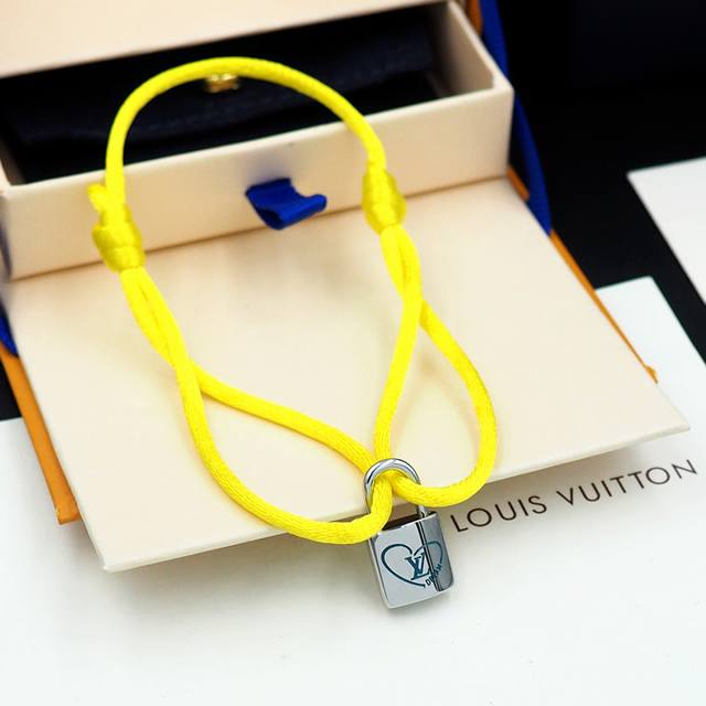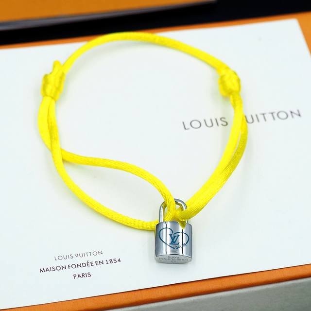 Donkey Family Charity Bracelet. This limited-edition Siver Lockt bracelet, part of a collaboration between Louis Vuitton and brand ambassador Lee Yong-bok, embodies the positive message of the renowned K-pop artist through traditional elements. The bracelet is crafted from recycled materials and paired with a fabric cord. It features the iconic padlock Georges-Louis Vitton created for the Steamer bag in 1901. Lee Yong-bok's heart-shaped ornament features the engraved Lv monogram and the word "Dream." The lacquer glaze adds a fresh, modern touch. Wear alone or layered. Yellow.