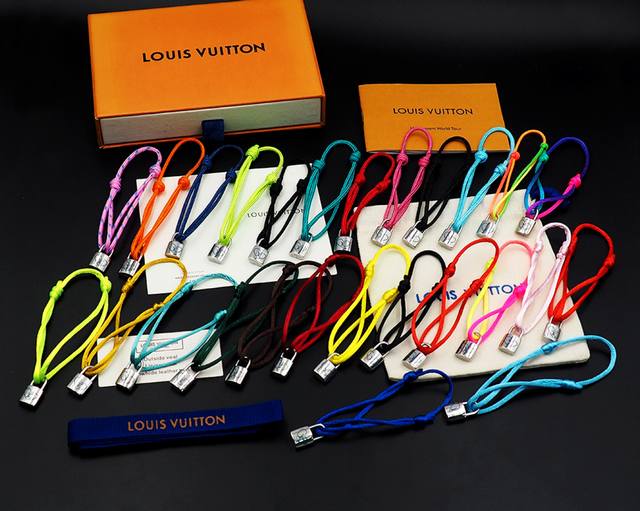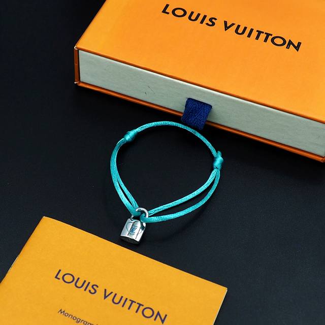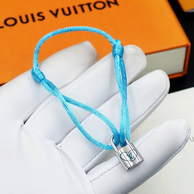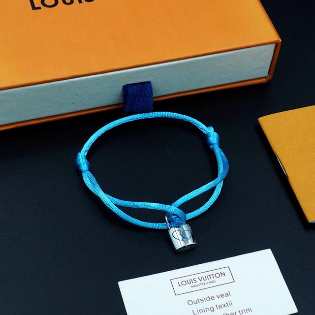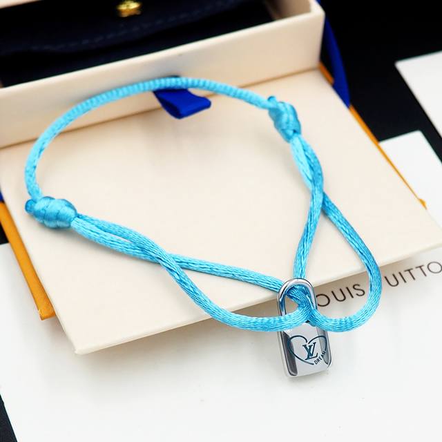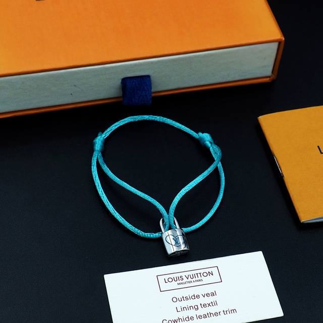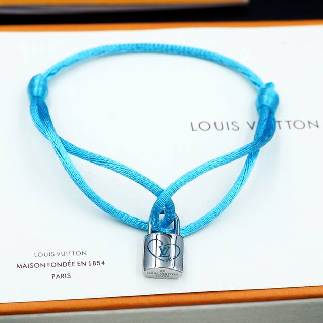 Donkey Family Charity Bracelet. This limited-edition Siver Lockt bracelet, part of a collaboration between Louis Vuitton and brand ambassador Lee Yong-bok, embodies the positive message of this renowned K-pop artist through traditional elements. The bracelet is crafted from recycled materials and paired with a fabric cord. It features the iconic padlock Georges-Louis Vitton created for the Steamer bag in 1901. Lee Yong-bok's heart-shaped ornament features the engraved Lv monogram and the word "Dream." The lacquer glaze adds a fresh, modern touch. Wear alone or layered. Blue