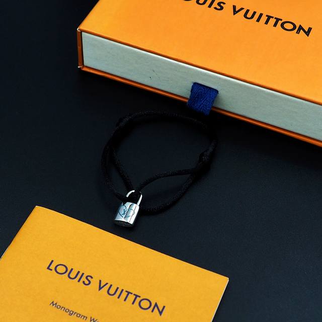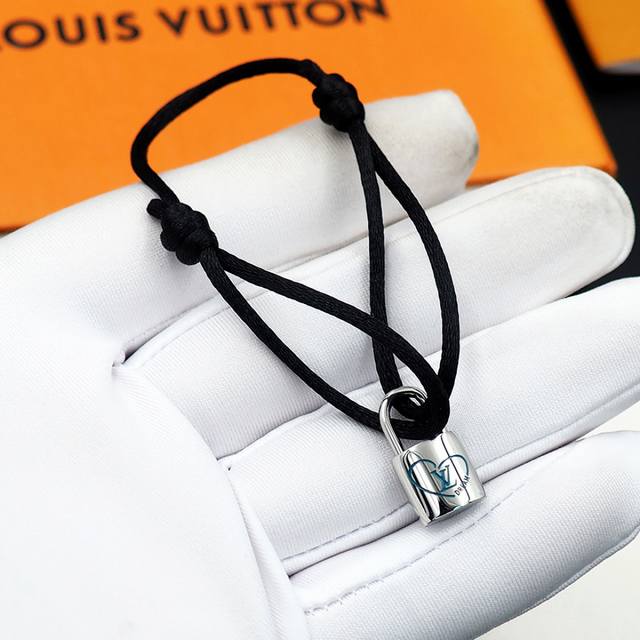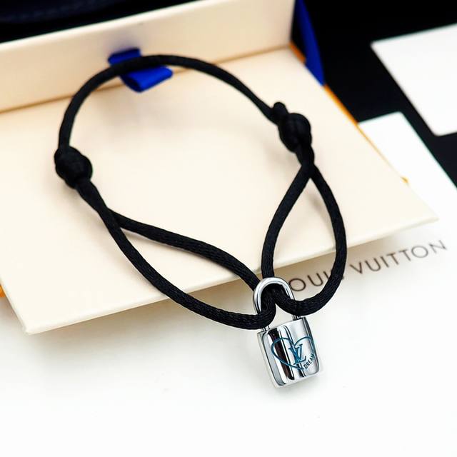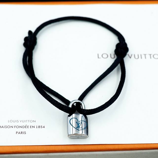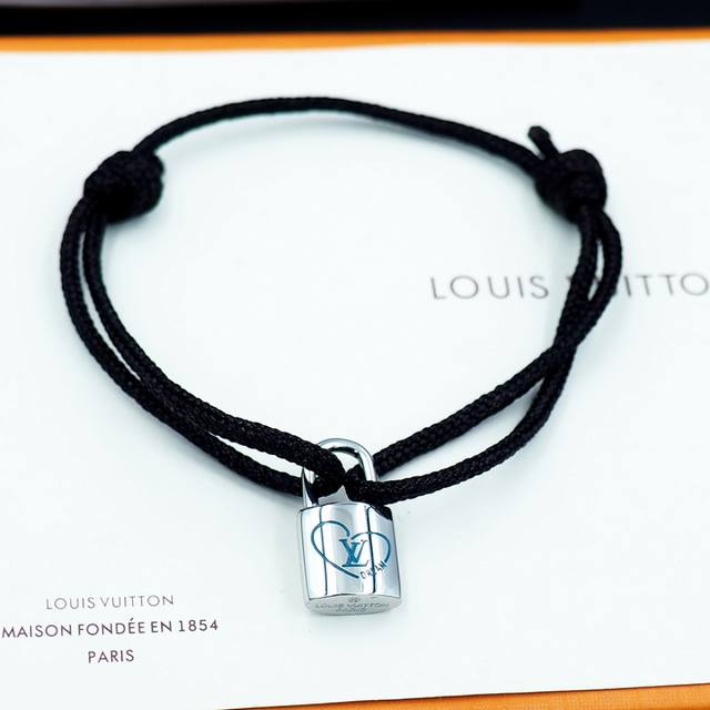 Donkey Family Charity Bracelet. This limited-edition Siver Lockt bracelet, part of a collaboration between Louis Vuitton and brand ambassador Lee Yong-bok, expresses the positive message conveyed by the renowned K-pop artist through traditional elements. The bracelet is crafted from recycled materials and paired with a fabric cord. It features the iconic padlock created by Georges-Louis Vitton for the Steamer bag in 1901. Lee Yong-bok's heart-shaped decoration features the engraved Lv monogram and the word "Dream." The lacquer glaze adds a fresh, modern touch. Wear alone or layered. Black.