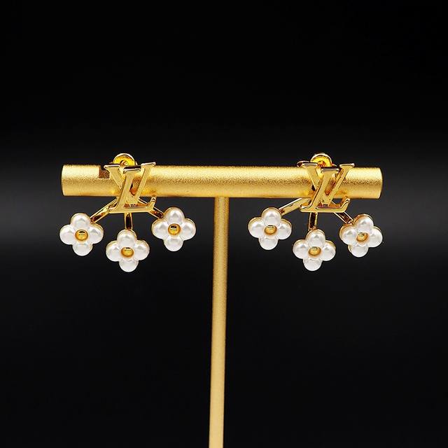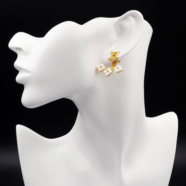 Donkey's LV Floragram earrings showcase a playful take on classic elements, enriching the visual experience through multiple materials: pearlescent resin and metal beads create a Monogram flower shape, playfully blooming behind the ear, secured with LV letter studs.