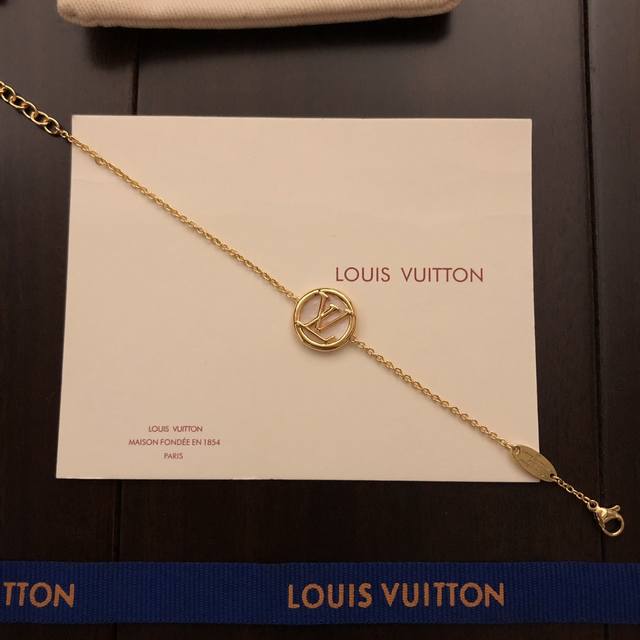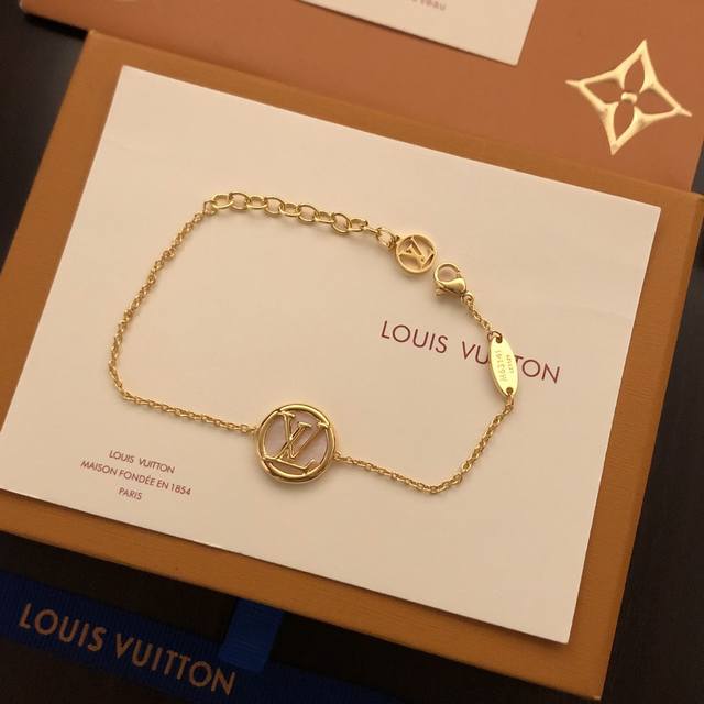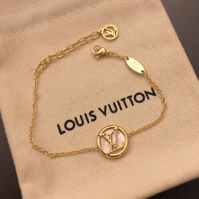 Exquisite Louis Vuitton LV bracelet, two-tone, double-sided, super versatile! A unique and beautiful design! The front features the logo in white mother-of-pearl, while the back has a printed logo pattern. Electroplated with 18K gold, a 1:1 replica of the boutique version. The gold color is perfect for summer, pairing well with various T-shirts, shirts, and dresses! Bracelet.