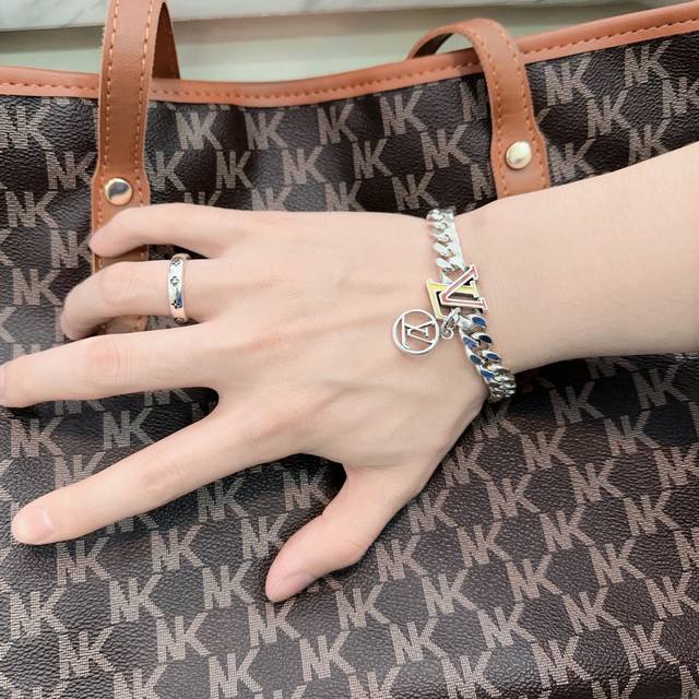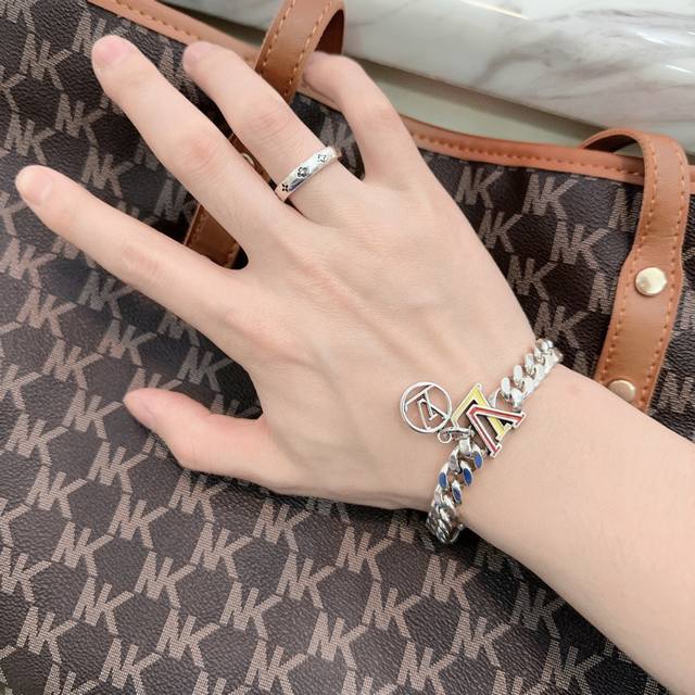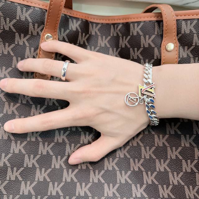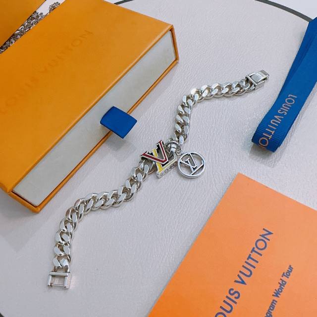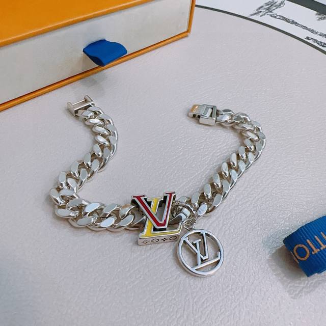 High-quality Louis Vuitton (LV) bracelet, original single item, new model, retro trendy fashion essential, unisex, couple style, rock punk Thai silver style, retro elements, trendy and versatile, same style as the official website, latest necklace, higher grade chain, celebrity classic style bracelet, Cuban chain series retro silver bracelet. Chain length sizes: 22cm, 20cm, 18cm, length can be altered. Details: accurate to the original, distressed finish, not the shiny version found in the market. This is a consistently popular LV style that goes very well with trendy clothes.