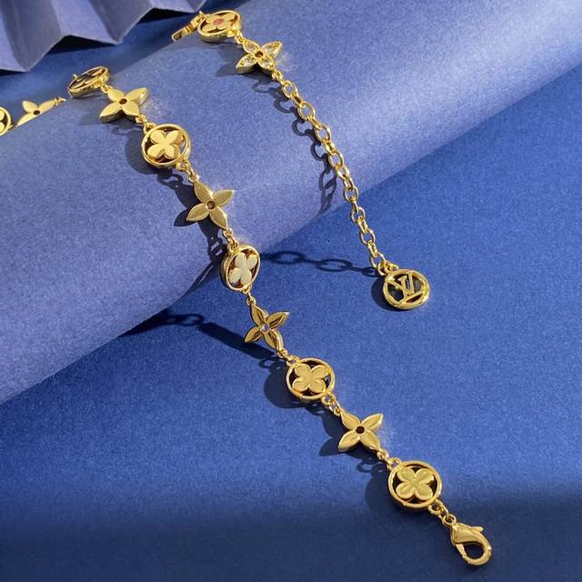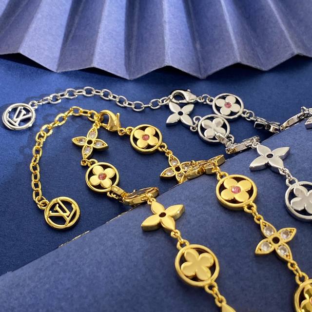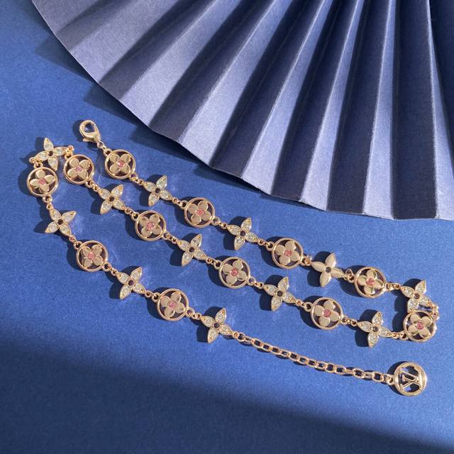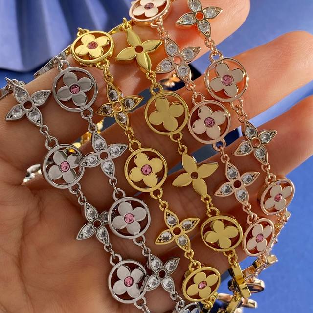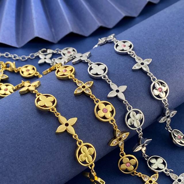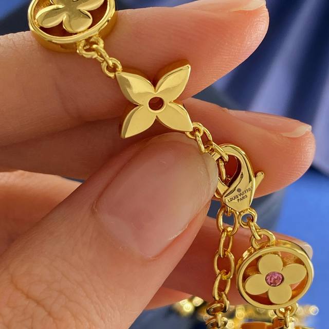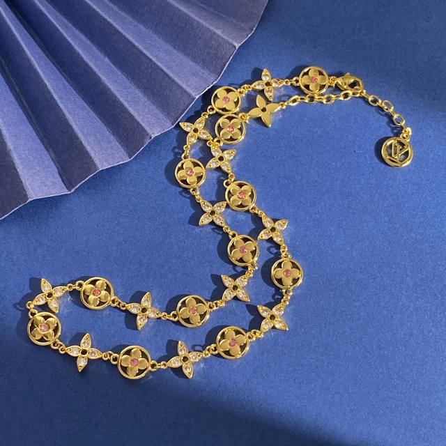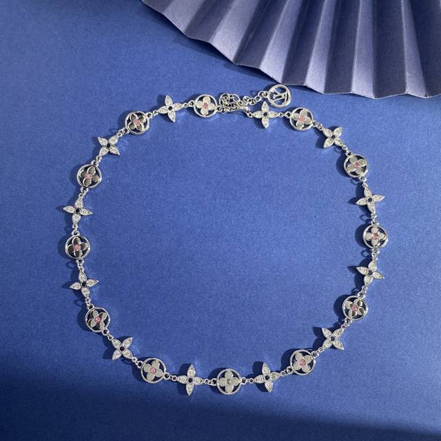 Louis Vuitton Fashion High-End Monogram Pattern Round Four-Leaf Clover Necklace with Pink Diamond Center, Diamond Cross Pattern, and Full Diamond Design. Available in brass, gold, silver, and rose gold. Necklace length approximately 41cm + 5.5cm + 1.3cm. Tag number: