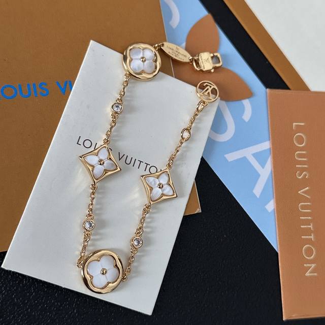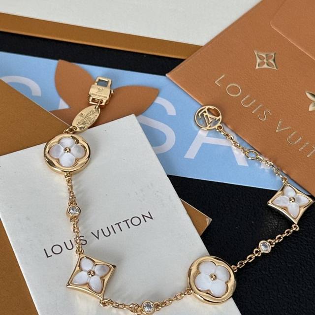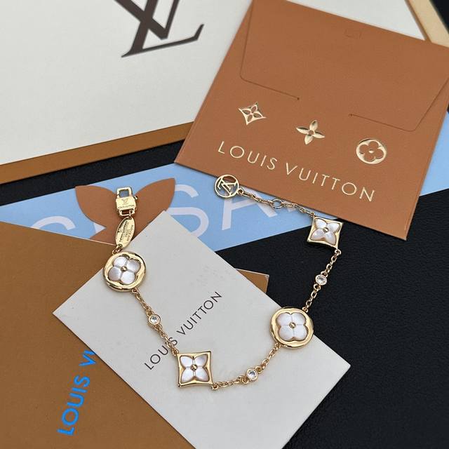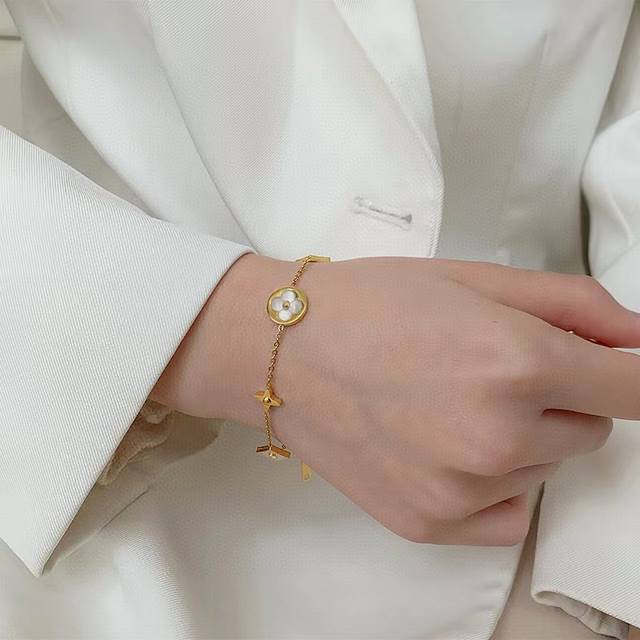 Louis Vuitton LV gold natural white mother-of-pearl bracelet. The natural mother-of-pearl is super shiny and high-end. Look at the monogram pattern, it's different from the fresh and sweet style. It's perfect for occasions that require a strong presence. It's also a very classy gift. A must-have for socialites, influencers, and goddesses. It looks amazing with natural mother-of-pearl.