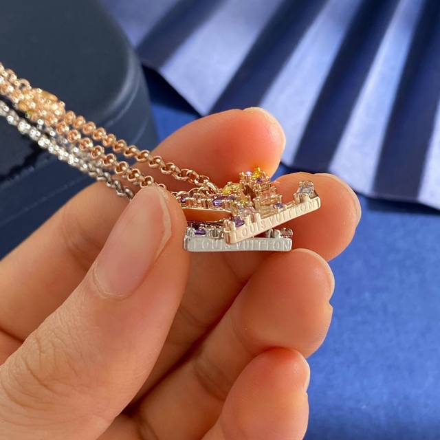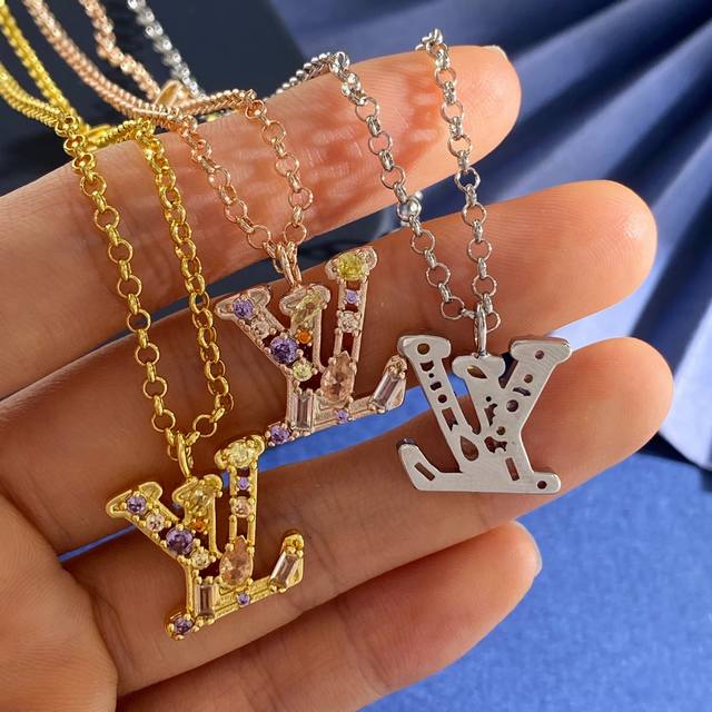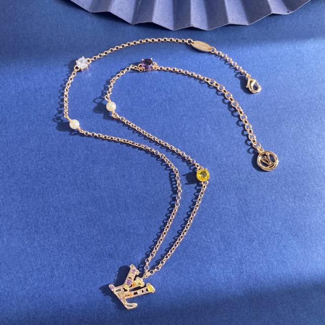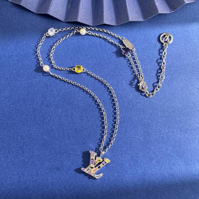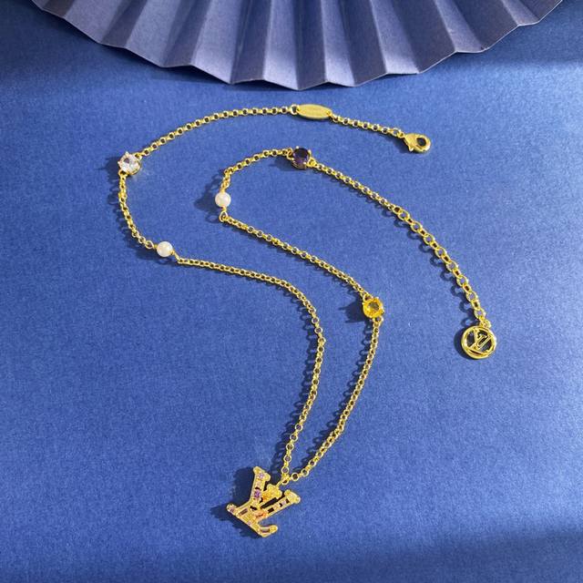 Lv Louis Vuitton fashion luxury Lv letter pendant inlaid with colored round diamonds and two pearls necklace made of brass with three colors of gold, silver and rose. Weight approximately 10.9g. Necklace length approximately 49cm + 5.5cm + 1.2cm tail plate; Lv letter approximately 1.78cm*1.7cm*0.35cm