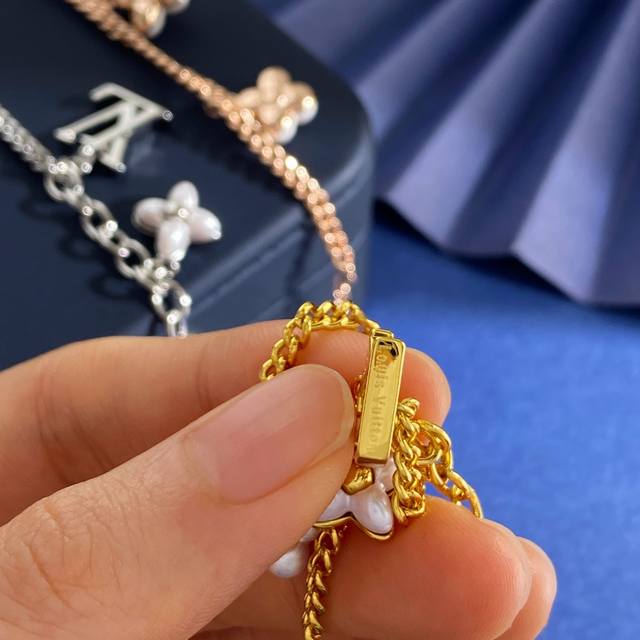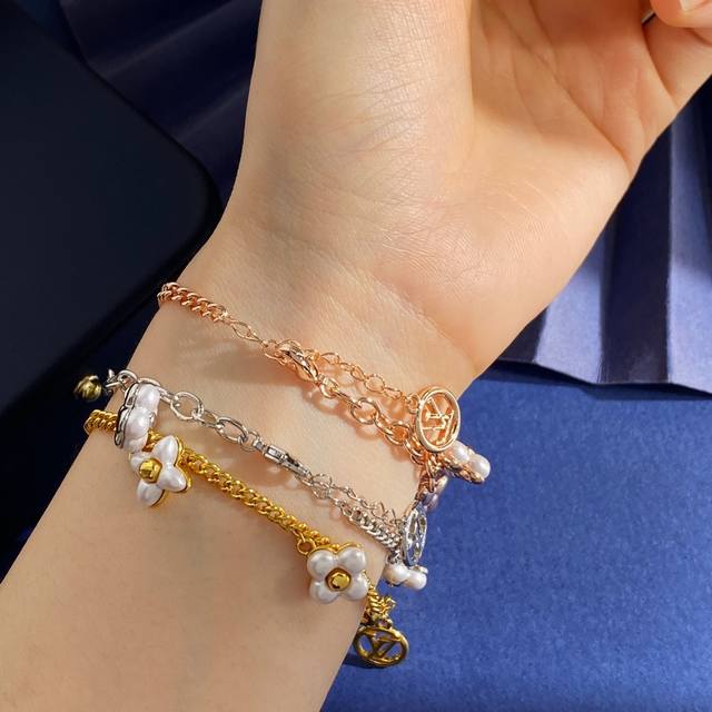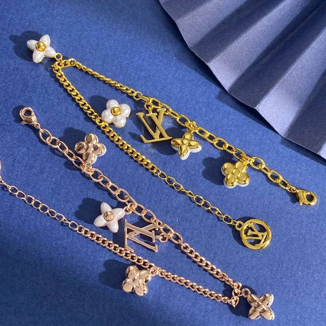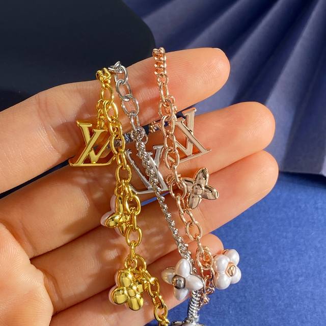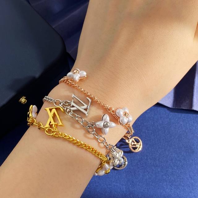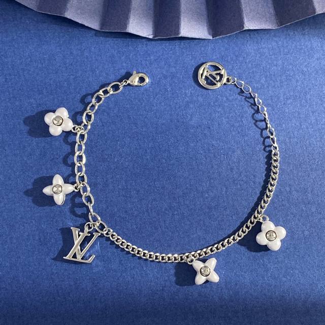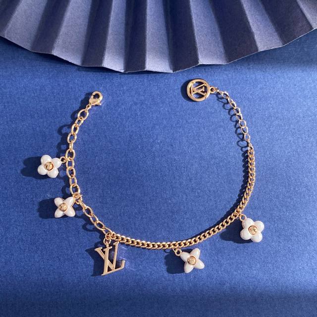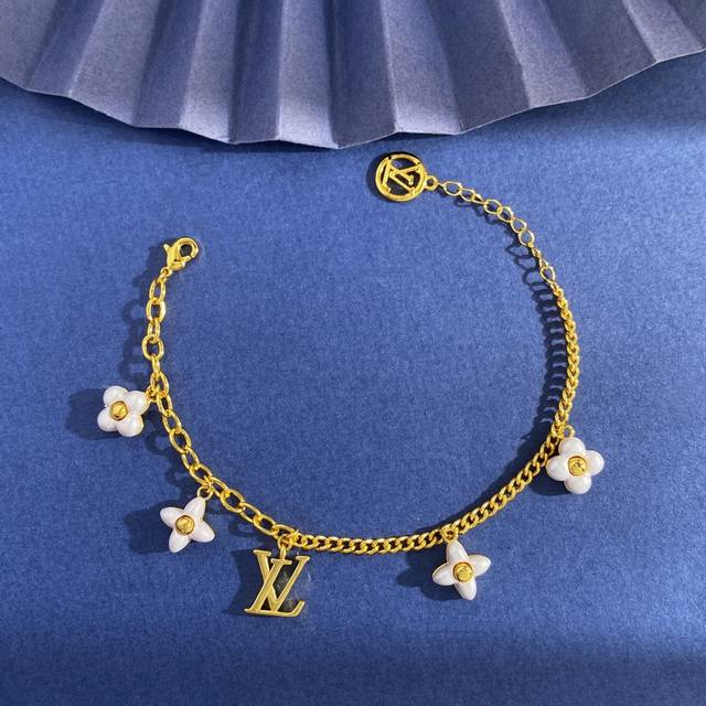 Lv Louis Vuitton fashion temperament old flower mother-of-pearl four small flowers diamond cross flower Lv smart pendant bracelet brass material gold, silver and rose 3 colors weight about 19.6G chain length about 17cm + 3cm + 1.3cm tail brand