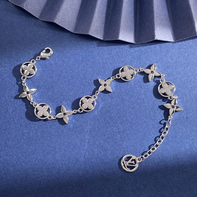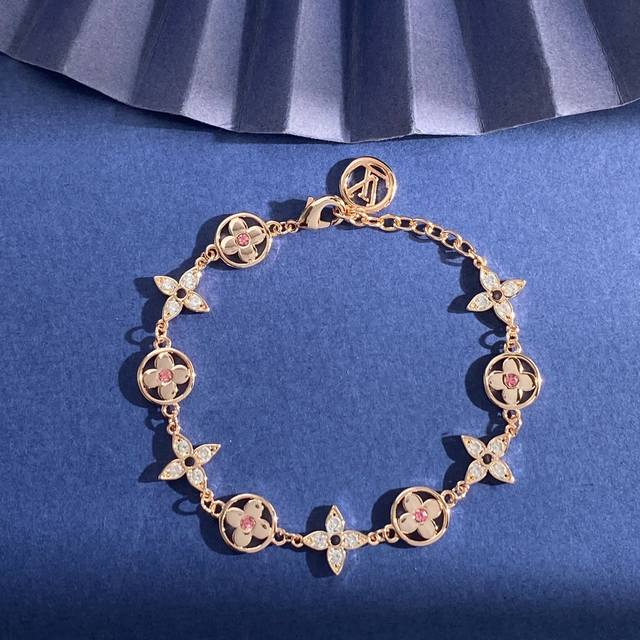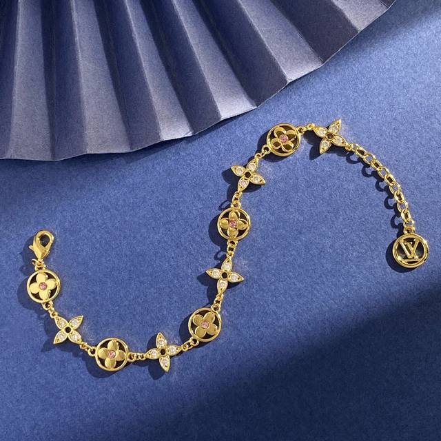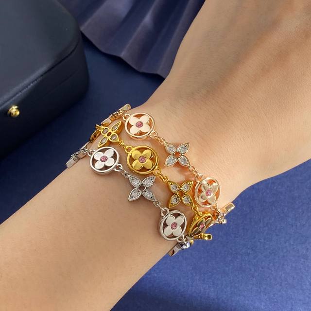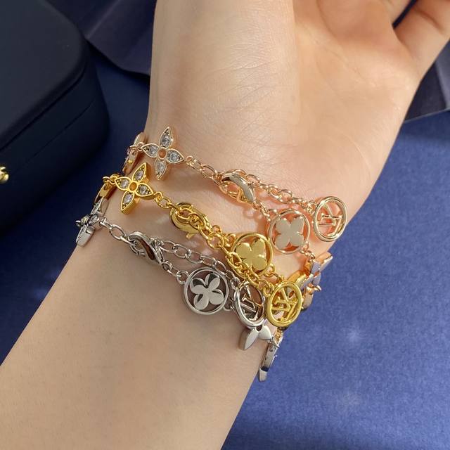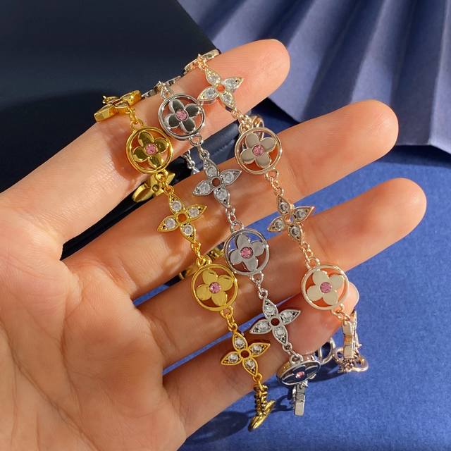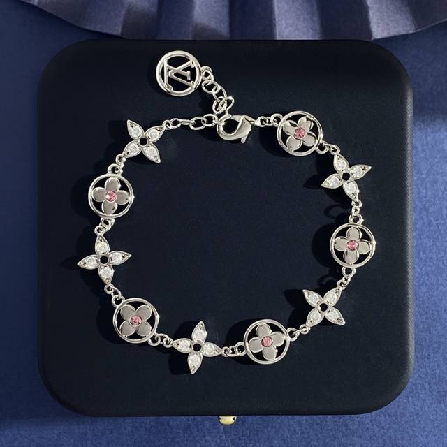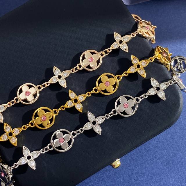 Lv Louis Vuitton fashion high-end glossy old pattern round four-leaf flower diamond flower cross flower inlaid with pink diamond bracelet made of brass, gold, silver and rose in 3 colors, weighing about 13g, bracelet length about 18cm+3cm+1cm, tail brand