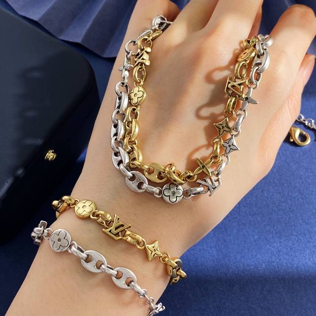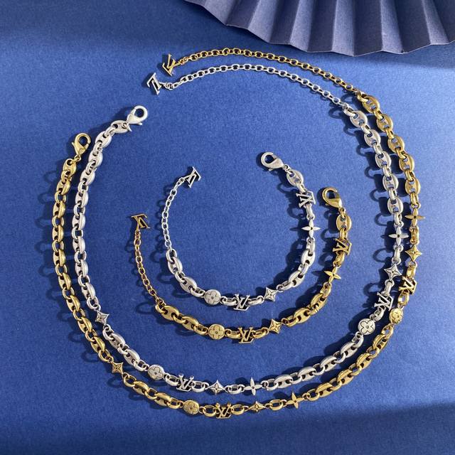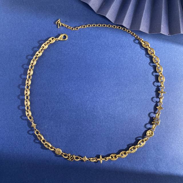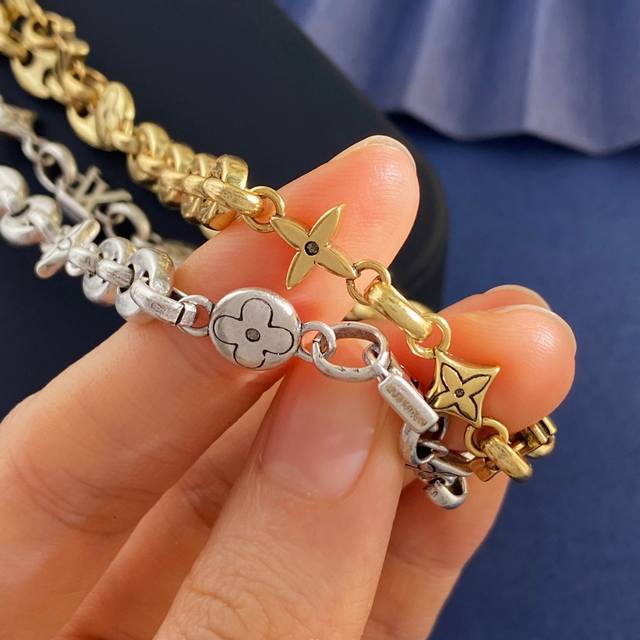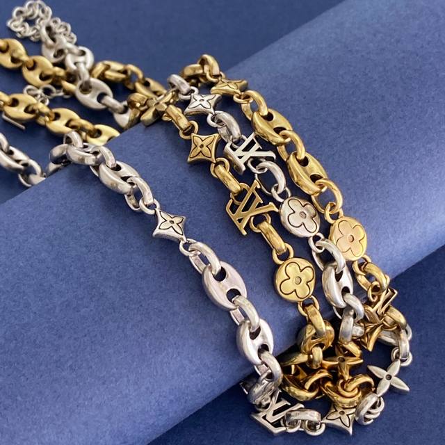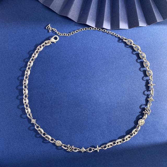 Lv Louis Vuitton new unisex retro design glossy Lv letter pig nose round four-leaf flower diamond cross flower old pattern multi-element distressed necklace brass material antique bronze silver necklace weight approximately 33.8G necklace length approximately 42cm + 9.5cm + 1cm tail brand