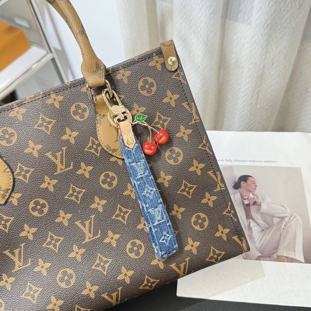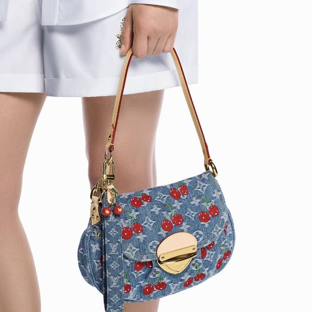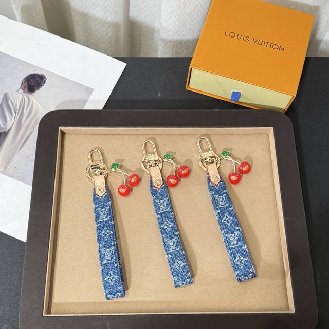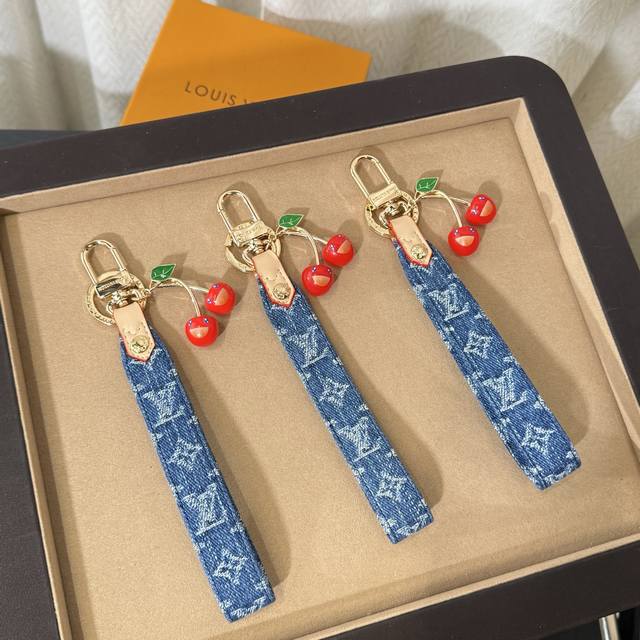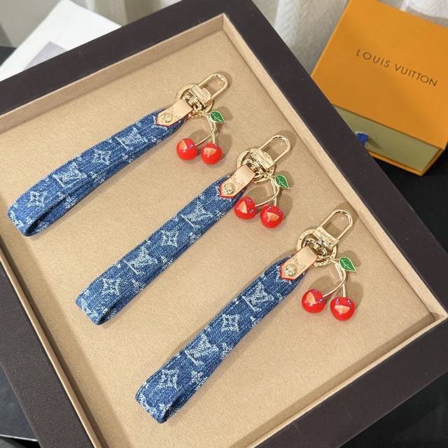 Lv Xtm Denim Cerise Dragonne Bag Charm from the Louis Vuitton x Takashi Murakami Collection, featuring playful designs that celebrate artistic creativity and exquisite craftsmanship. The smiling cherry embellishment captures the Japanese artist's anime perspective. Paired with a Monogram embroidered denim strap and a convenient spring buckle, it adds a modern touch to any look.