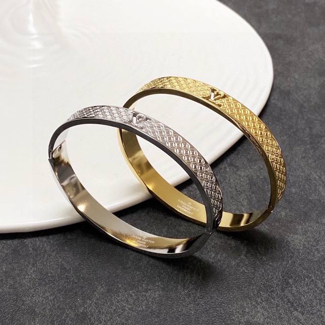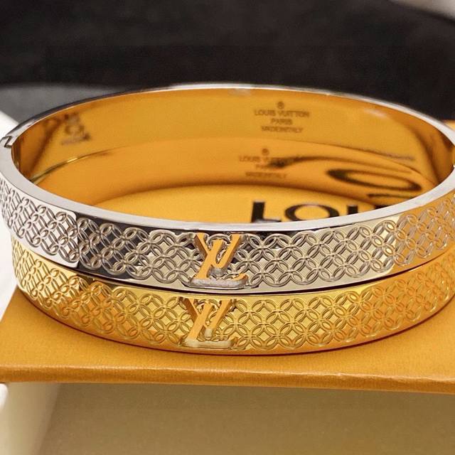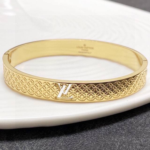 New Arrival Original LV Letter Hollowed-out Bangle. Made with the same materials as Louis Vuitton boutiques, this popular style features a unique, retro, and avant-garde design. The 14K gold finish has been a favorite among women since its release, with each color possessing its own unique brilliance! It looks stunning on the wrist! The smallest and most elegant version! More flattering and brightens the complexion than the standard version.