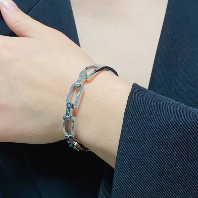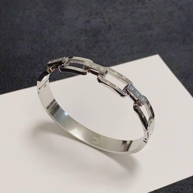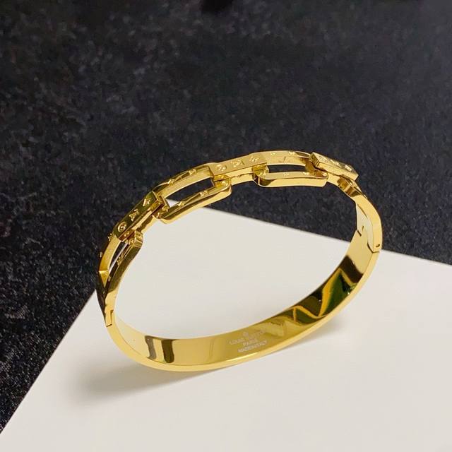 New Original LV Letter Print Four-Leaf Clover Carved with Logo Tank Interlocking Hollow Out Bangle. Louis Vuitton, same material as boutique items, a hot-selling style with a unique retro-avant-garde design. The 14K gold finish has been a favorite among women since its launch; each color has its own unique brilliance! It looks stunning on the wrist! The smallest size available! More flattering and makes skin appear fairer than the regular version.
