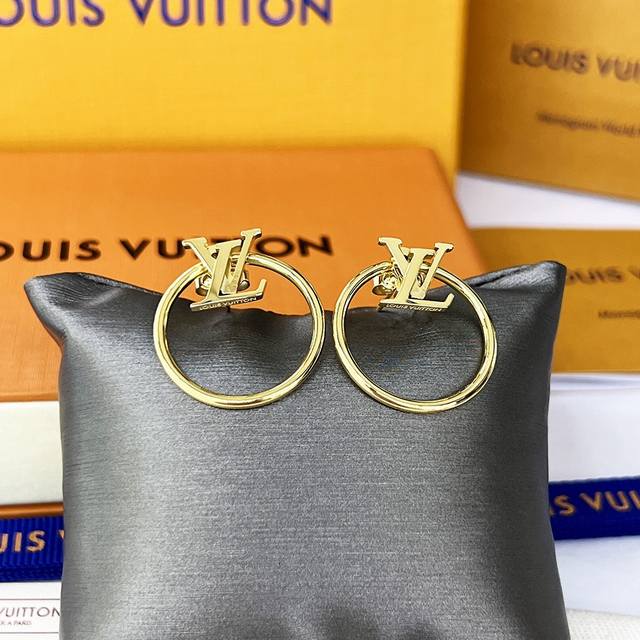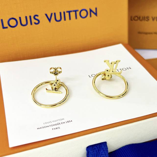 The Louis Vuitton Eclipse earrings are from the LV Eclipse collection, showcasing the brand's exquisite craftsmanship with their elegant design and unconventional clasp. The letter LV sits gracefully on one side of the earlobe. Delicate hoops extend from behind the ear, witnessing this classic logo rotate to various positions within the hoop.