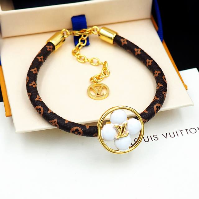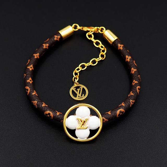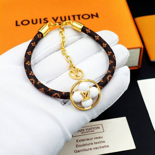 The Louis Vuitton (LV) Pearty Flower leather bracelet interprets the brand's classic style with exquisite brushstrokes and meticulous details. Monogram leather cord is integrated with lustrous Monogram flower beads, and the dazzling LV lettering is nestled on it.