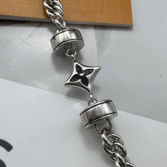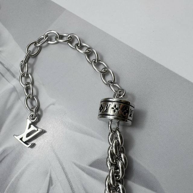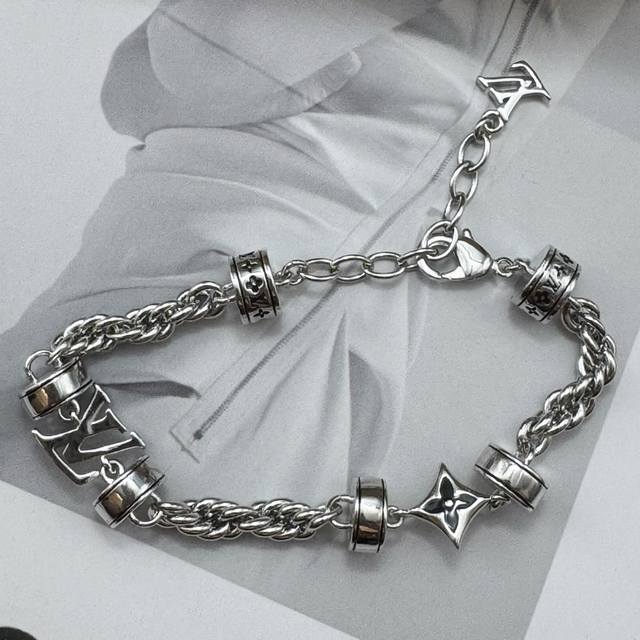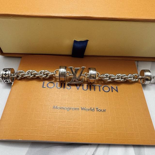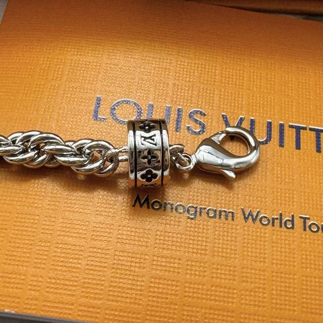 Lvwire bracelet is crafted in Italy with brass links mimicking the texture of thick rope. A one-day treatment adds a touch of age, and the bracelet is interspersed with the letters "Lv" and Monogram flowers, allowing it to be easily incorporated into various styles.