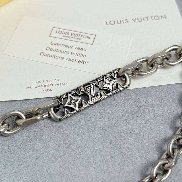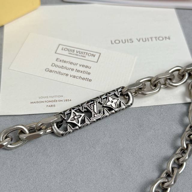 Label belt chain boasts the lustrous texture of brass, combining delicate and rugged chains in a trendy style. The meticulously crafted nameplate draws attention, with Monogram flowers surrounding the central Lv lettering.