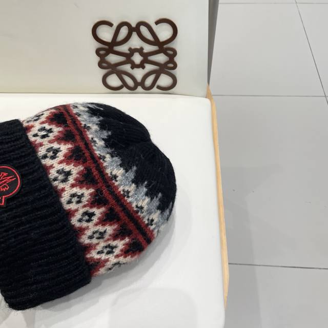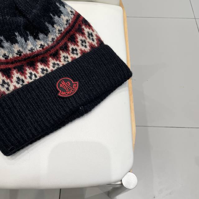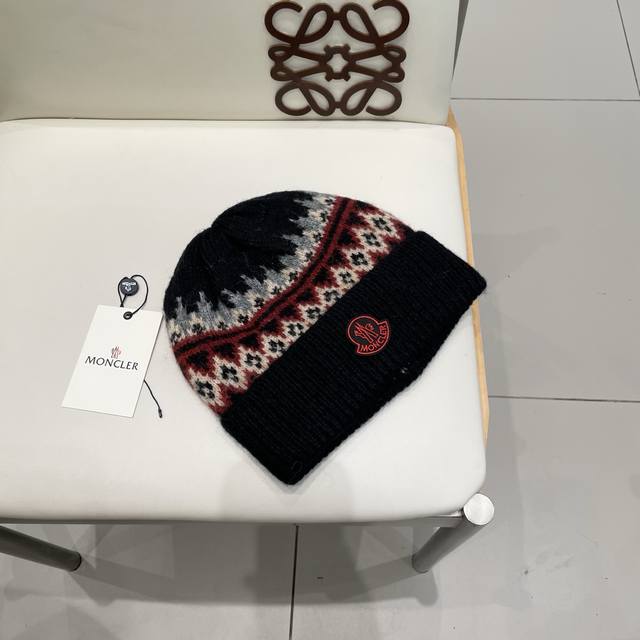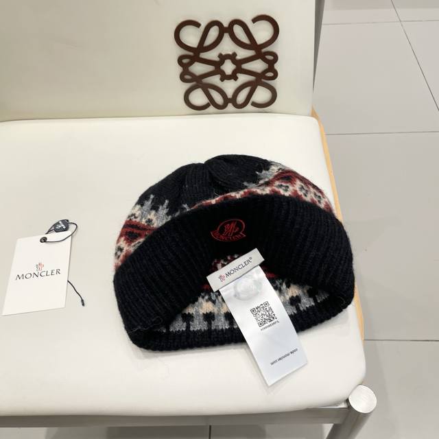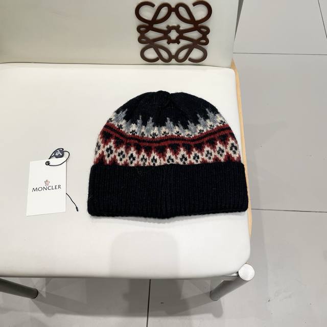 Moncler Wool Blend Knitted Hat for Women, Autumn/Winter, Warm and Thick, Korean Retro Fashion Jacquard Knitted Pullover Hat