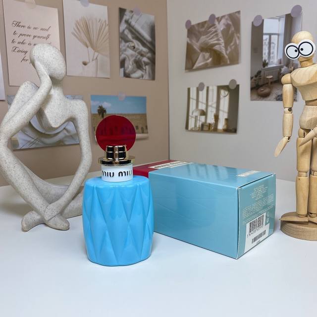 Miu Miu Eau de Parfum with Red Cap, Vintage Pleated Style. Fragrance Notes: Floral. Top Notes: Lily of the Valley; Middle Notes: Jasmine, Rose, Green Leaves; Base Notes: Akigalawoo.