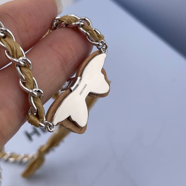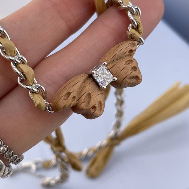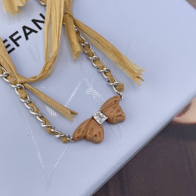 We offer the Hf detachable wooden butterfly necklace Z 990! A super unique design! You'll be captivated at first sight! The new season's garden series features dead leaf butterflies integrated with tree patterns, full of vitality. Inspired by the exuberant vitality of nature, craftsmen carved three-dimensional butterflies from beech wood with the warm touch of wood, and the concave position replicates the veins of the dead leaf butterfly's wings, making it lifelike! The braided strap chain is made of hand-woven raffia, and the bow is detachable, adding a fashionable touch to everyday wear and expressing ease and elegance. The custom pull-out buckle design allows for free adjustment of length! A must-have for sophisticated women, very stylish! New earrings from the same series are also released simultaneously, and