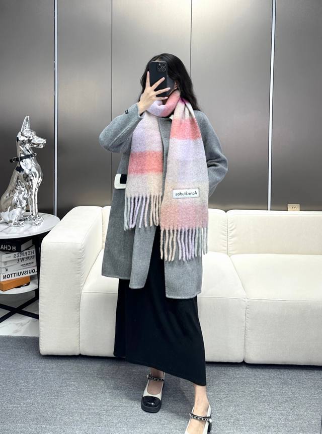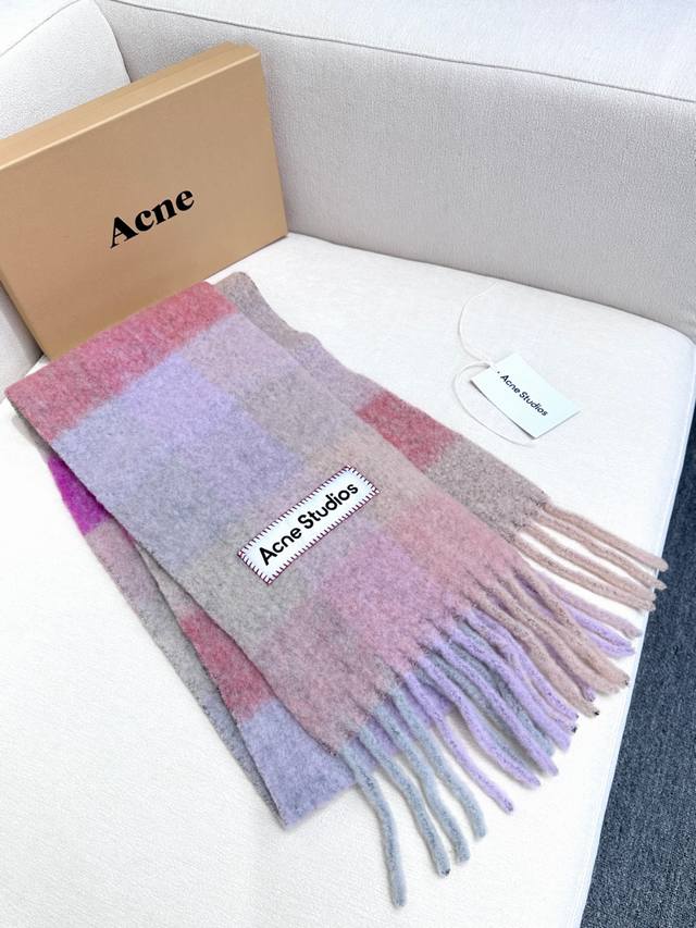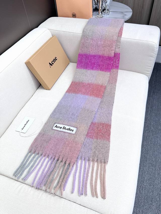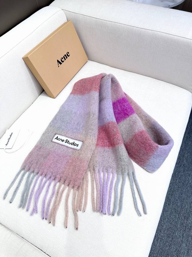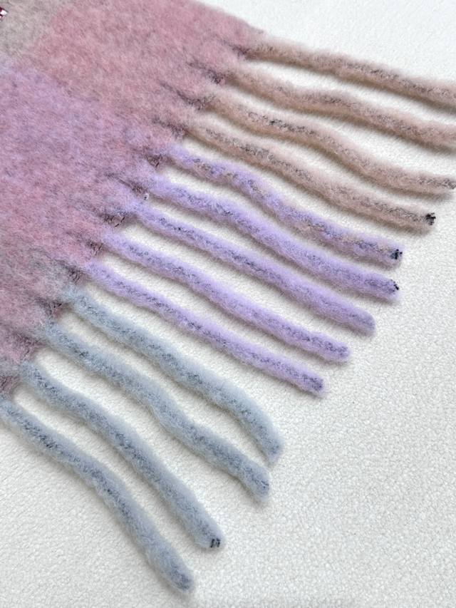 Annual Hot Item Arrives! Original Factory Order, Acne New Alpaca and Mohair Rainbow Scarf, Warm Colors of Stockholm! Love at First Sight, Super High-Value Design! Dreamy Color Scheme, Outshines All Versions on the Market, Genuine Original Goods. Acne scarves always surprise. The classic "Valley" oversized version originated in Italy, incorporating warm Nordic color blocking, super versatile, immersed in various color swatches. In winter, you can bury your head in this large scarf, super warm and cozy! High coverage, makes your face look smaller! Mohair with wool content, the fabric is crisp and comfortable, the thick tassels are as cute as shrimp chips! The hand-stitched oversized logo is exceptionally exquisite and surprising! Specifications: 28*250Cm, Composition: 33% Alpaca Wool 25% Wool 22% Nylon 20% Mohair