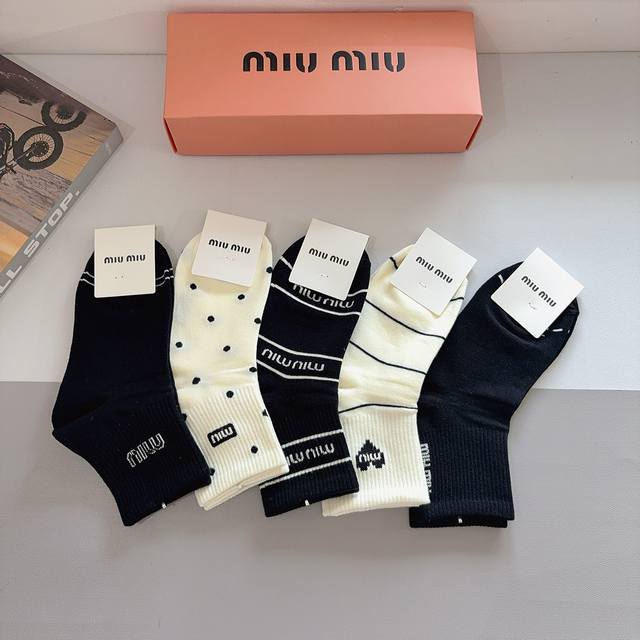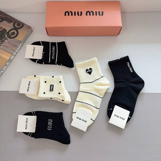Box of 5 pairs of Miumiu socks (with packaging) - High-quality, super popular mid-calf socks recommended by Instagram celebrities and influencers. Extremely hot! Made of pure cotton, lightweight, soft, and breathable, suitable for all seasons. A must-have for European and American high-end street style.