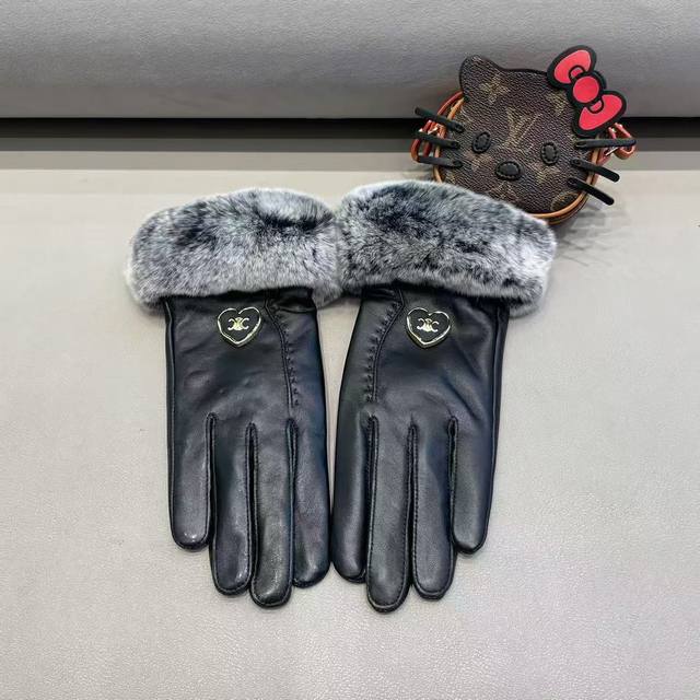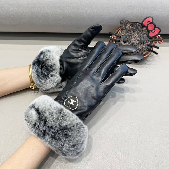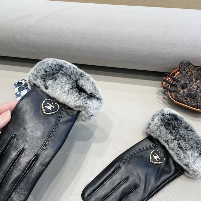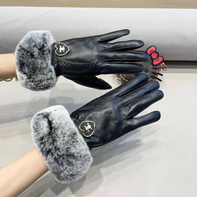 Celine women's new rabbit fur sheepskin gloves, fashionable gloves, warm in aut