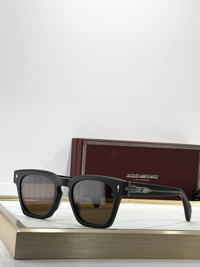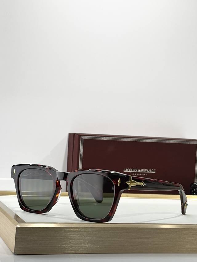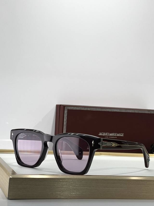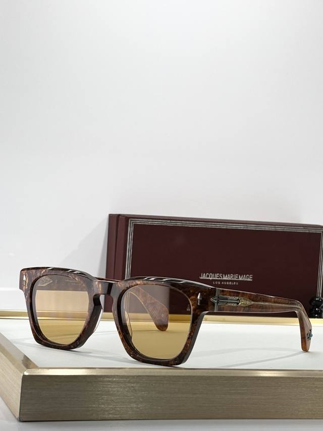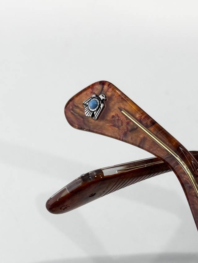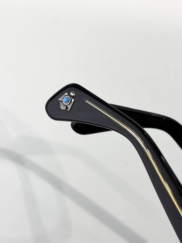 Color-Changing Jacques Marie Mage Turquoise Series 8.0 Thick Material Custom Original Replica Japanese Handmade Eyeglasses Frame. The frame is crafted from thick metal to create a vintage look, while the lenses retain delicate lines, showcasing the craftsman's skill. The overall design is perfect, especially the unique contours of the temples, which are rarely seen elsewhere. The studs continue the classic Jmm arrow design and are made of precious metals, injecting elegance into the sophisticated design. Model: Rawlins Size: 49 (23-146)