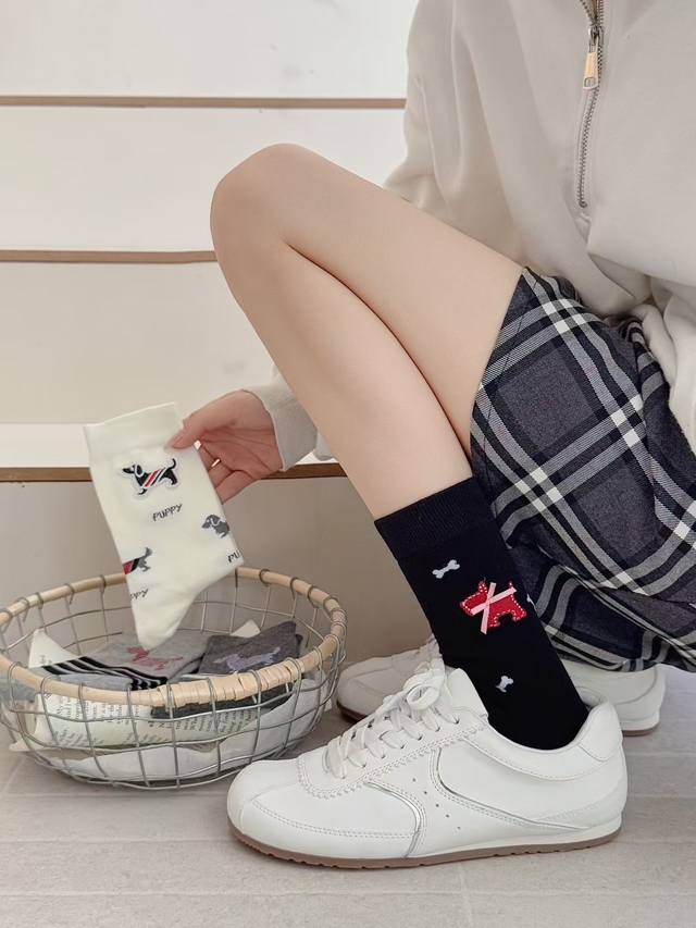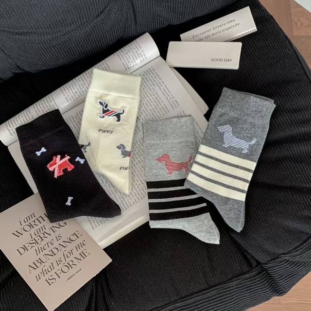 Comes in a box of four pairs of Thom Browne Tb super popular online celebrity mid-tube socks. The classic three-stripe design with a puppy design is highly recommended by Instagram celebrities and online celebrities. Made of combed cotton, it is light, soft and breathable, suitable for all seasons. It is a must-have for European and American street brands.