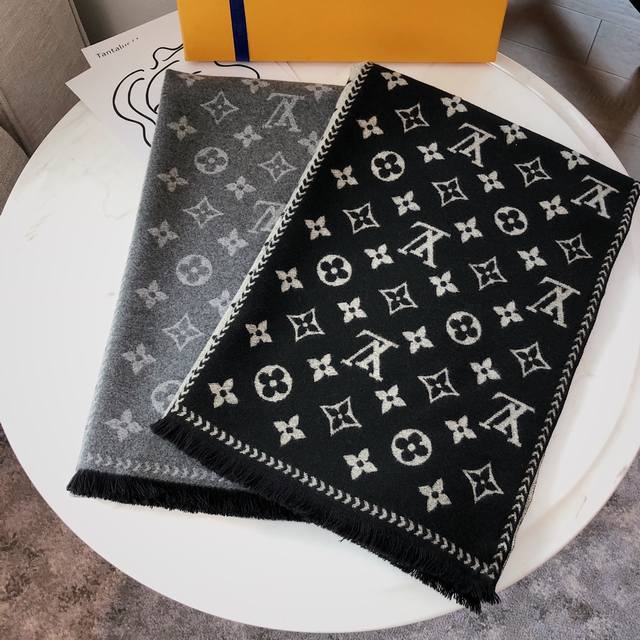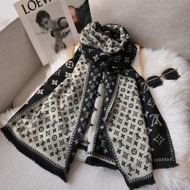European style, new L-brand color-blocked letter border jacquard scarf, fashionable and high-end style, exquisite workmanship and good feel, excellent value for money, perfect for gifting or personal use. Suitable for multiple ages, warm and stylish, Size: approximately 180cm x 65cm, Weight: 330g. (
